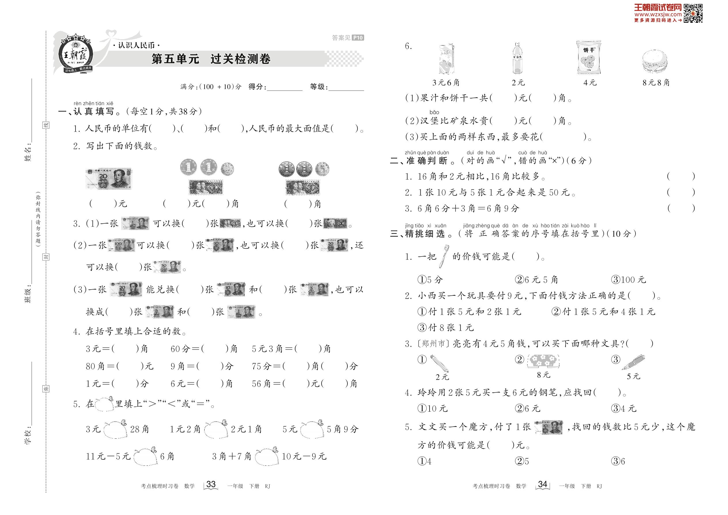 2023下册一年级数学人教版 第五单元 过关检测卷