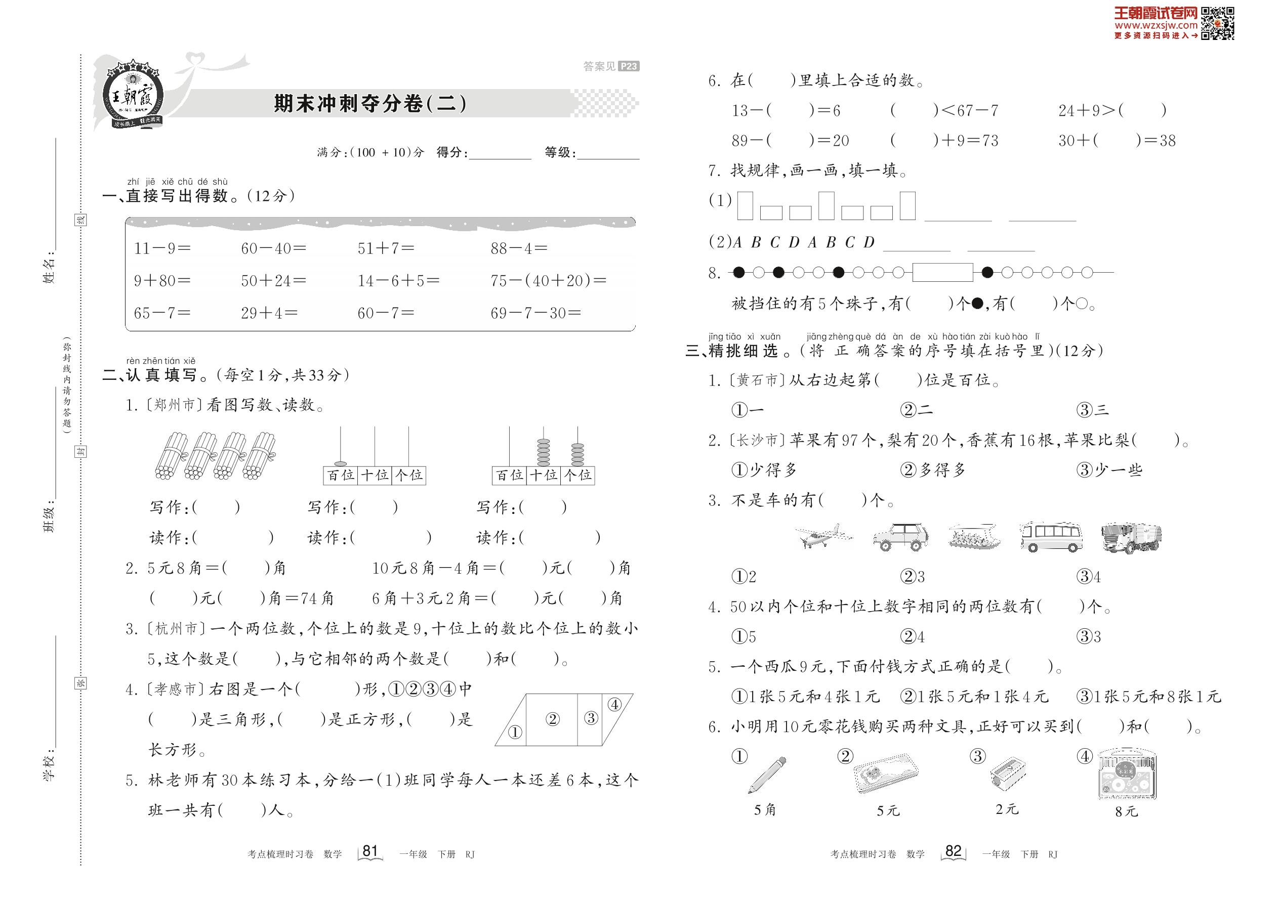 2023下册一年级数学人教版 期末冲刺夺分卷(二)