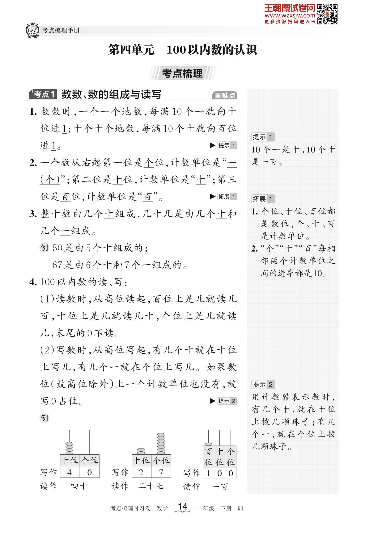 2023下册一年级数学人教版 考点梳理手册——第四单元 100以内数的认识