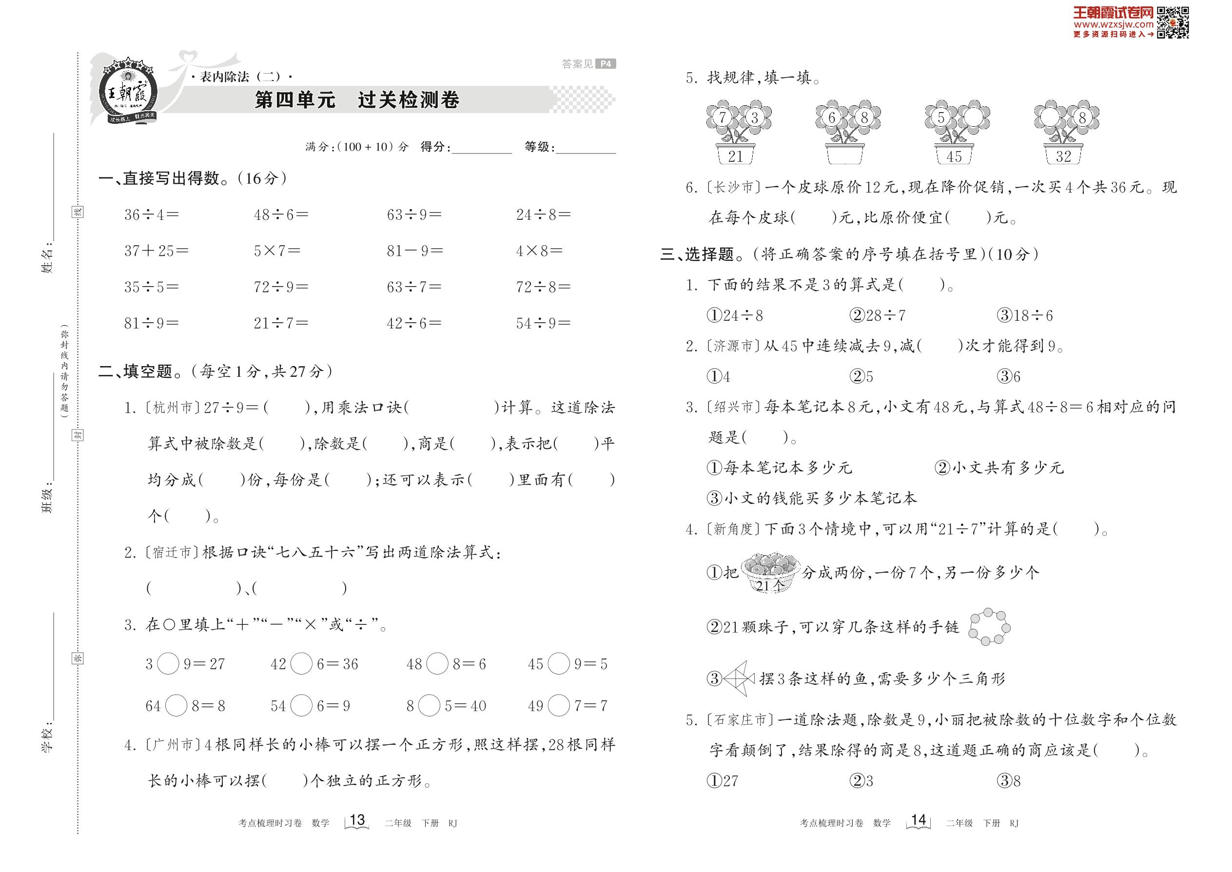 2023下册二年级数学人教版 第四单元 过关检测卷