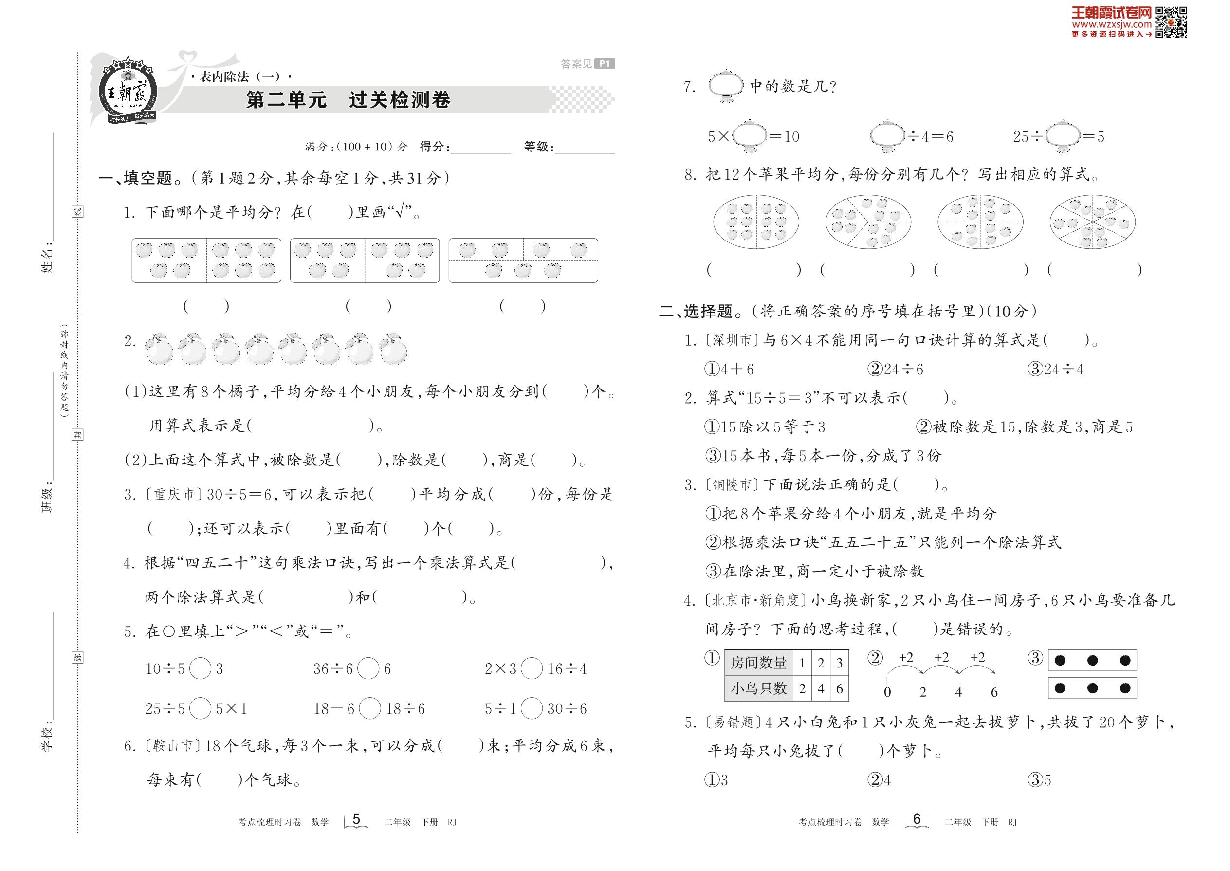 2023下册二年级数学人教版 第二单元 过关检测卷
