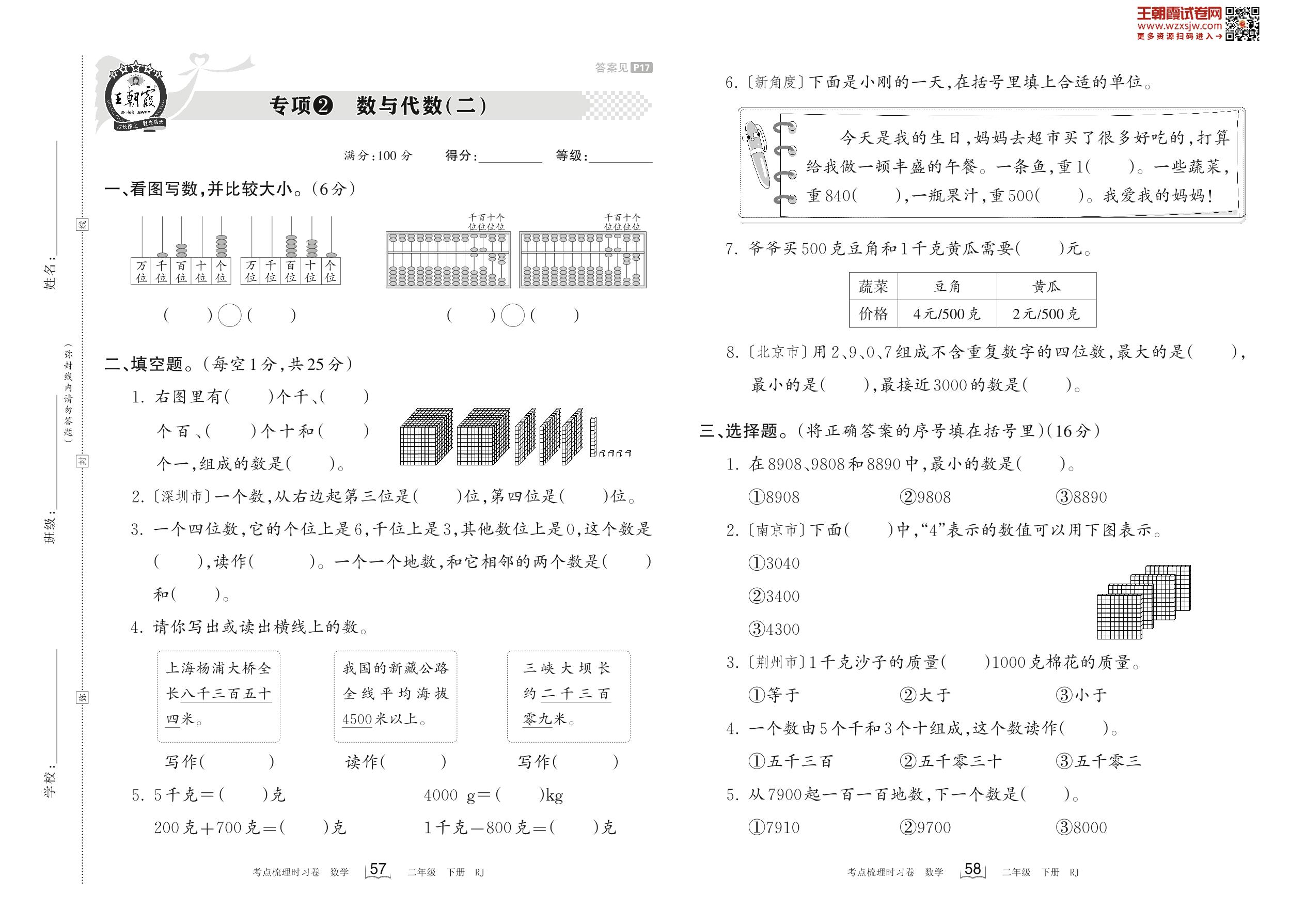 2023下册二年级数学人教版 专项2 数与代数(二)