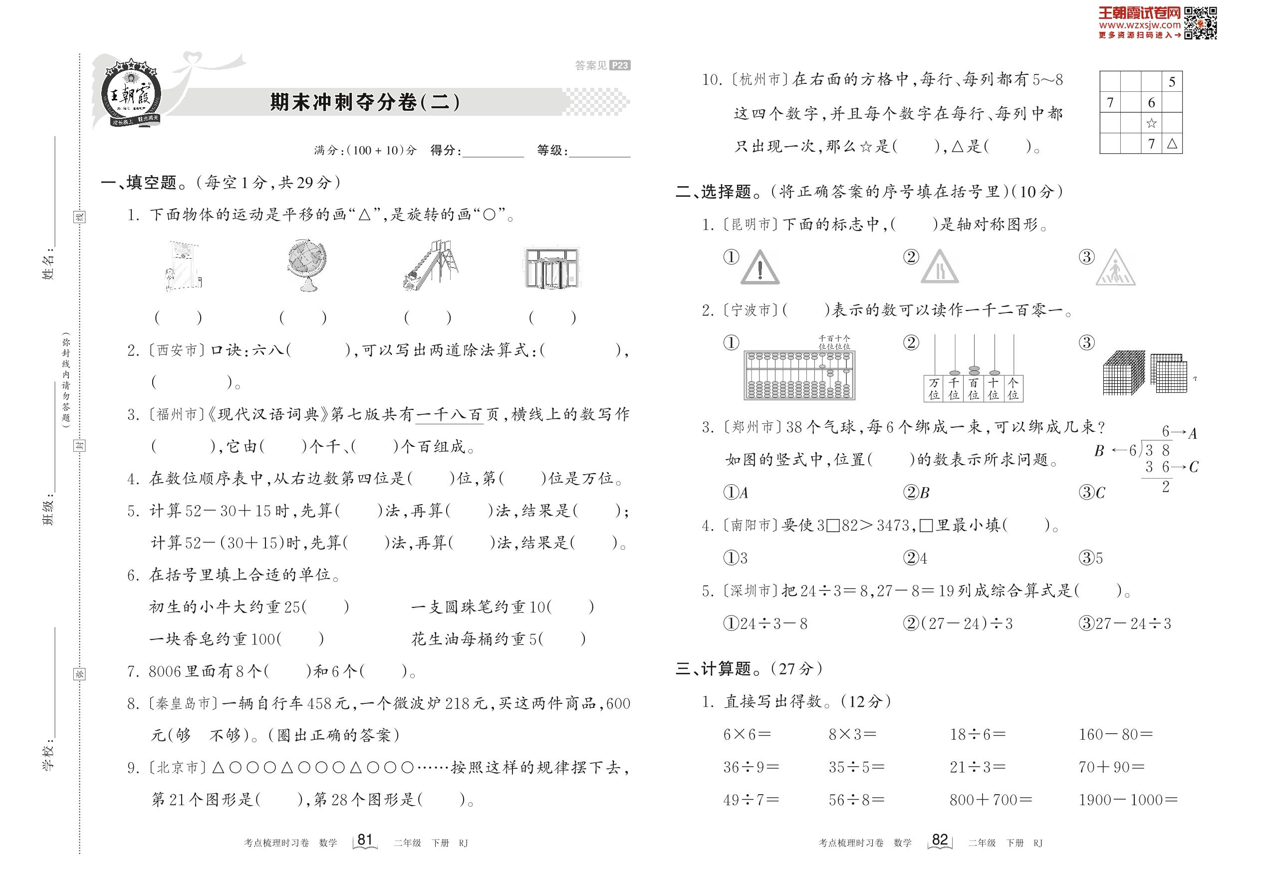 2023下册二年级数学人教版 期末冲刺夺分卷(二)