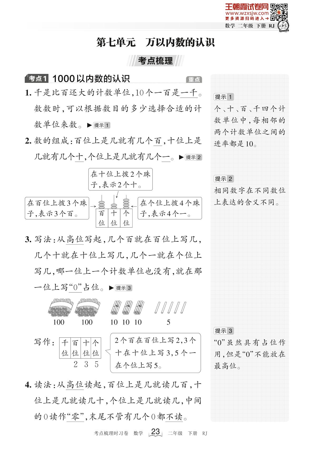 2023下册二年级数学人教版 考点梳理手册——第七单元 万以内数的认识
