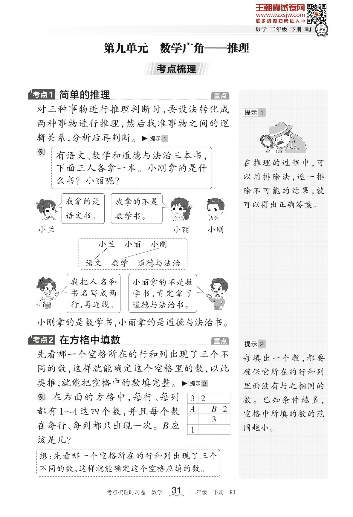 2023下册二年级数学人教版 考点梳理手册——第九单元 数学广角——推理