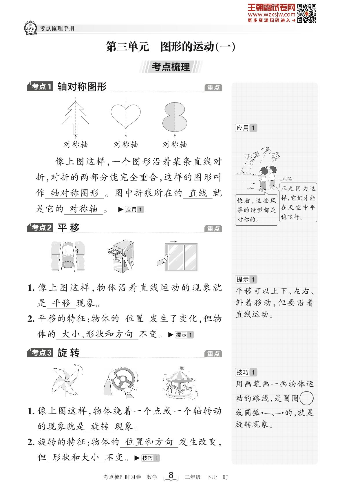 2023下册二年级数学人教版 考点梳理手册——第三单元 图形的运动(一)