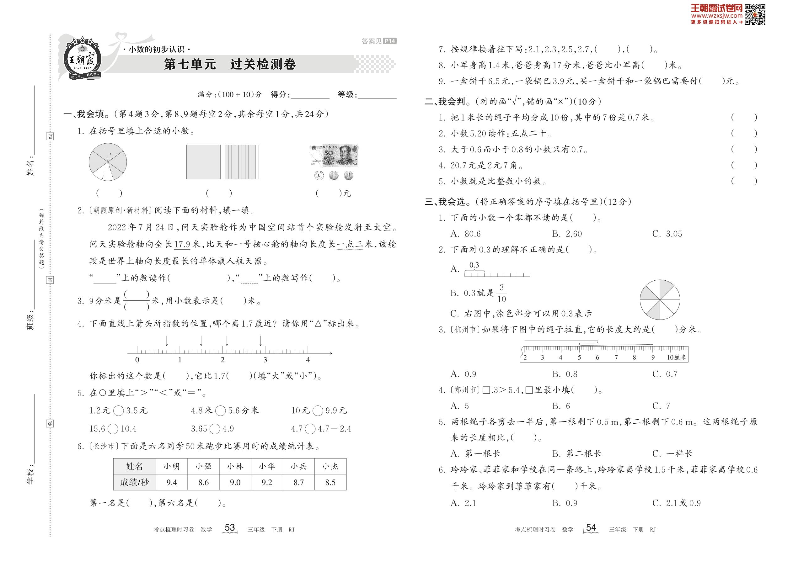 2023下册三年级数学人教版 第七单元 过关检测卷