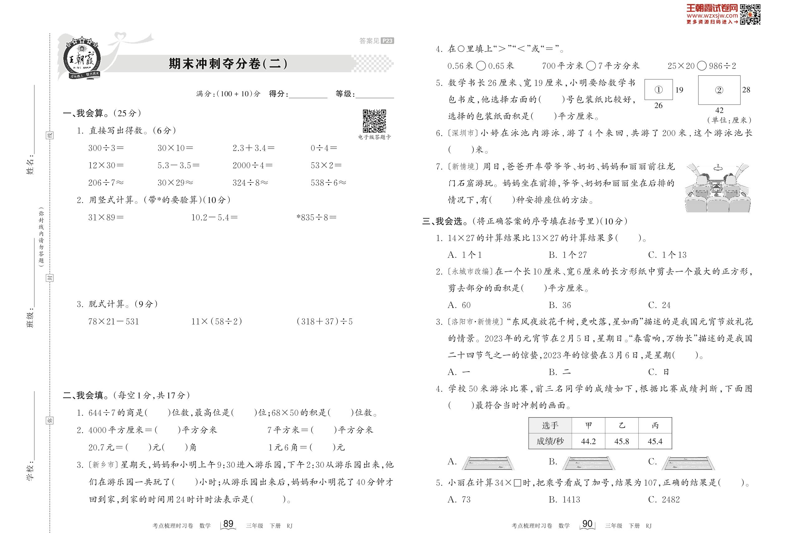2023下册三年级数学人教版 期末冲刺夺分卷(二)