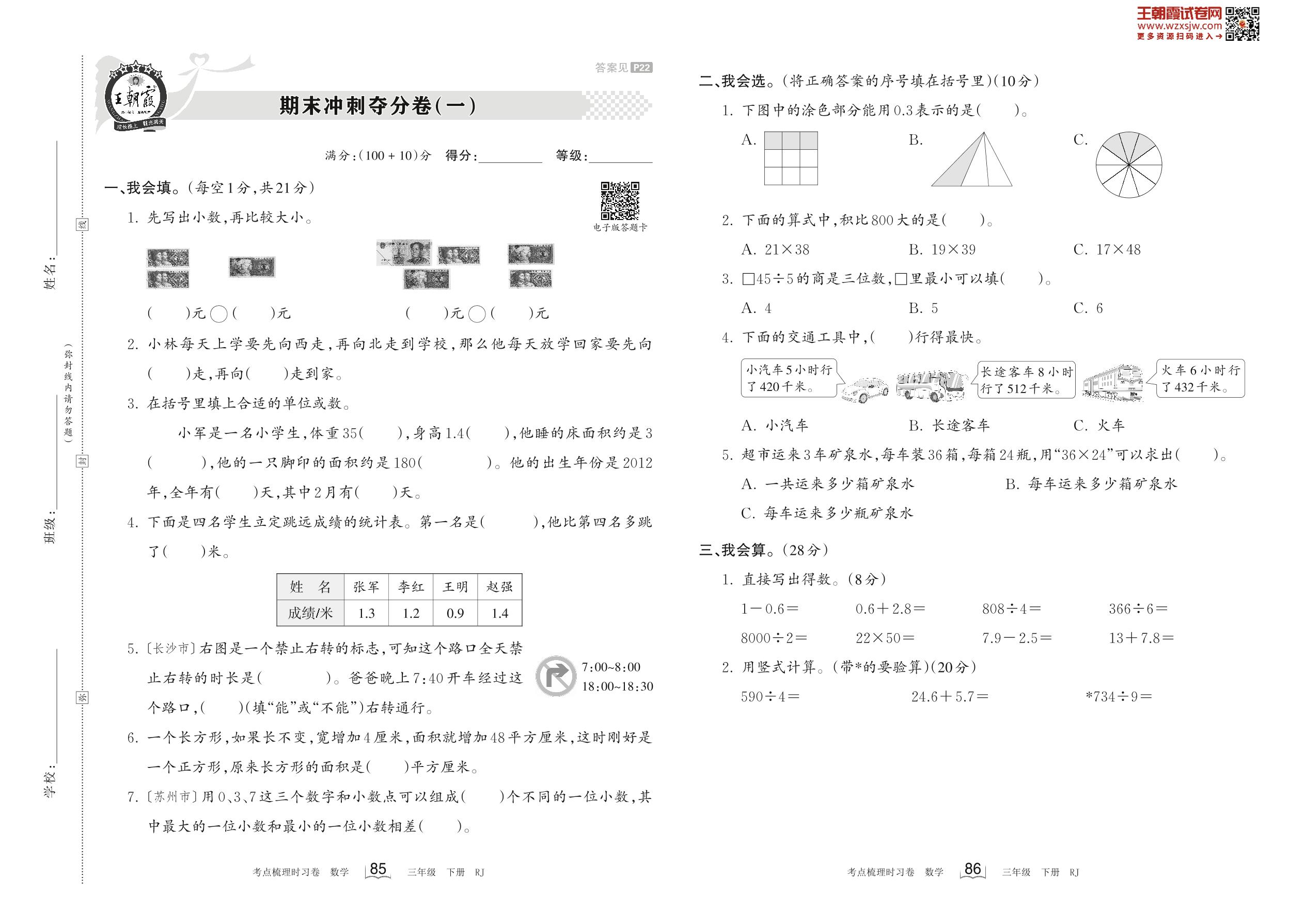 2023下册三年级数学人教版 期末冲刺夺分卷(一)