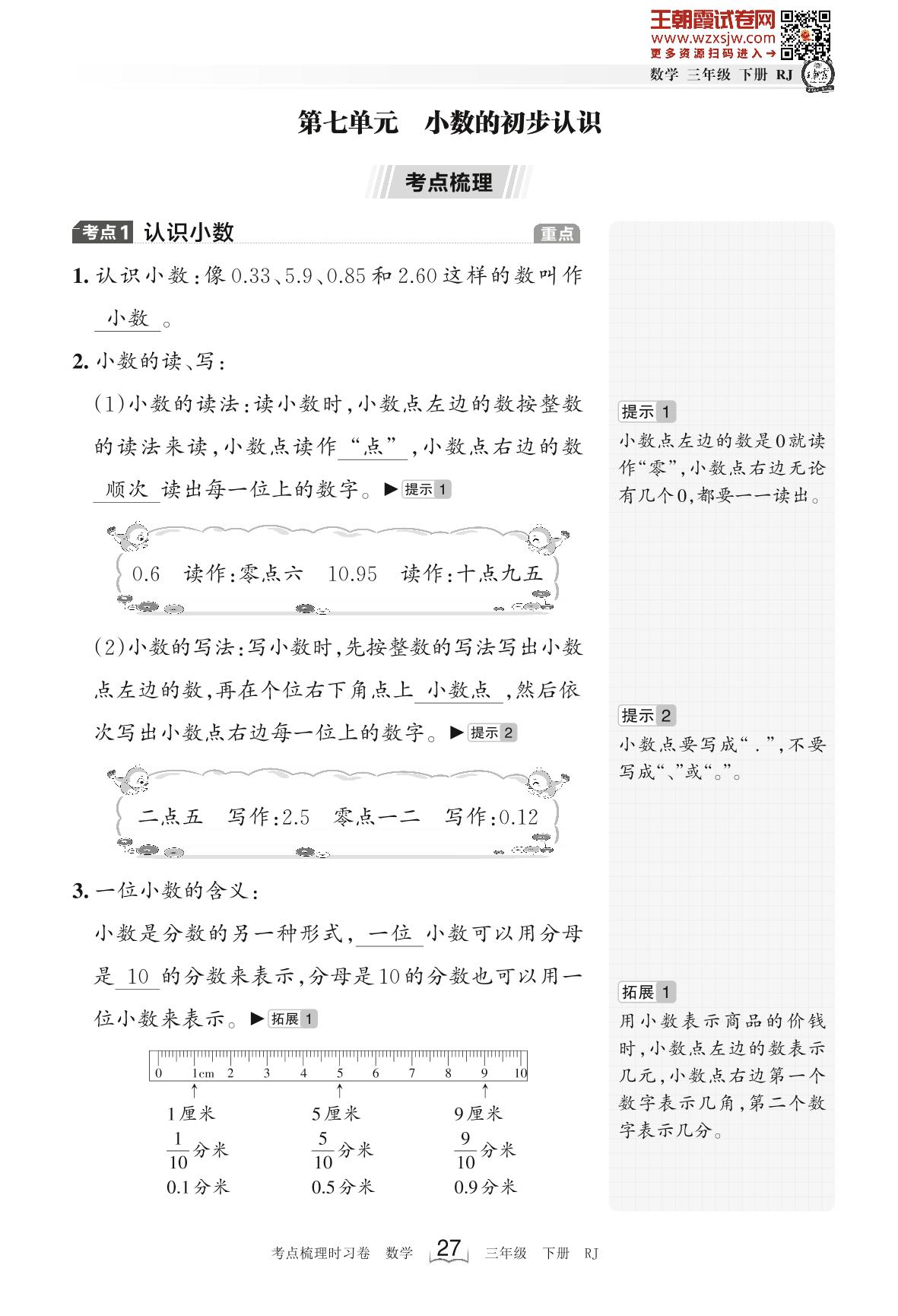 2023下册三年级数学人教版 考点梳理手册——第七单元 小数的初步认识