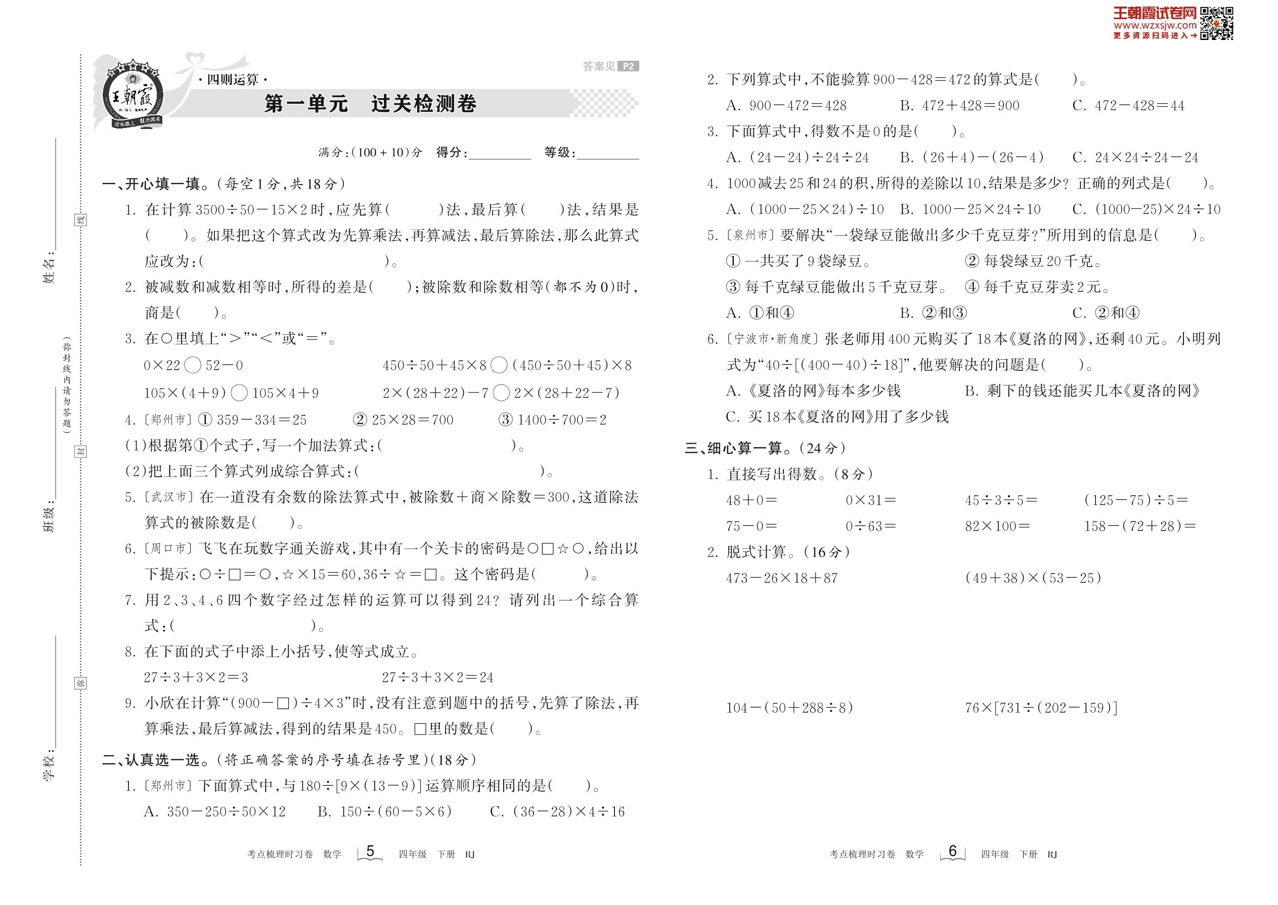 2023下册四年级数学人教版 第一单元 过关检测卷