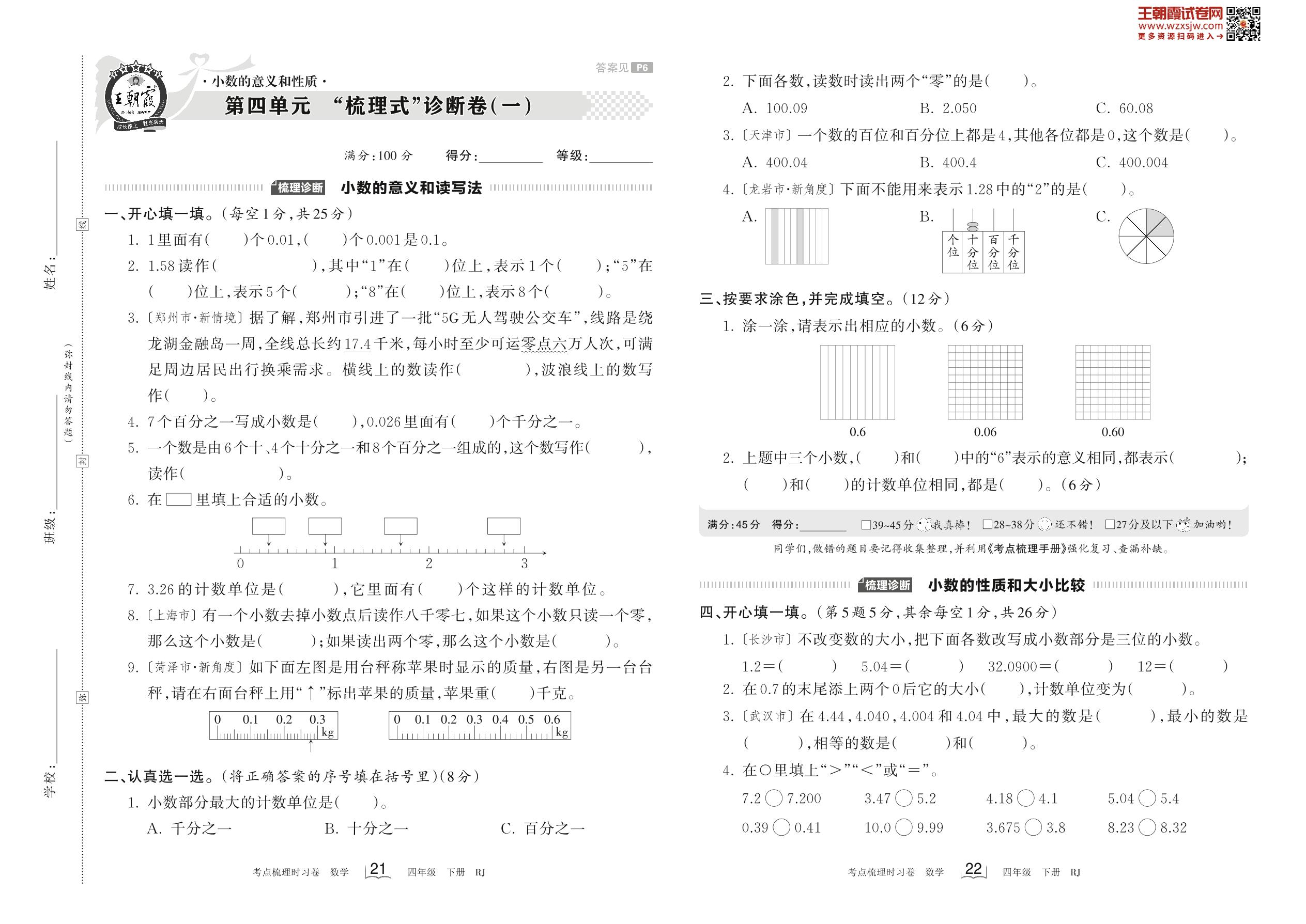 2023下册四年级数学人教版 第四单元 “梳理式”诊断卷(一)