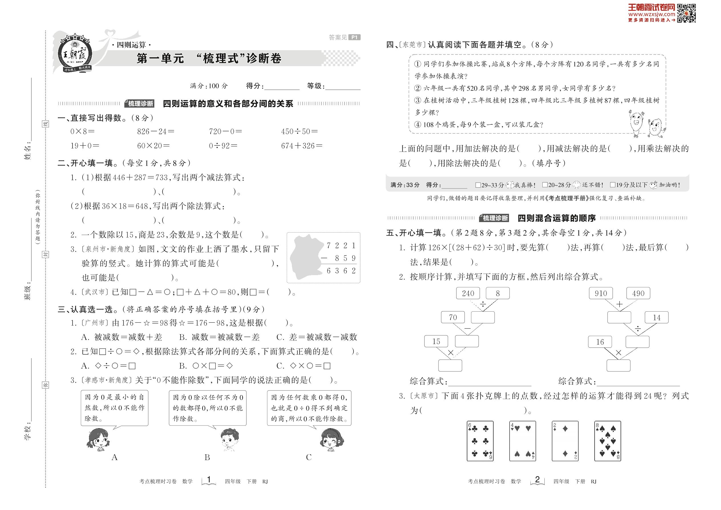2023下册四年级数学人教版 第一单元 “梳理式”诊断卷
