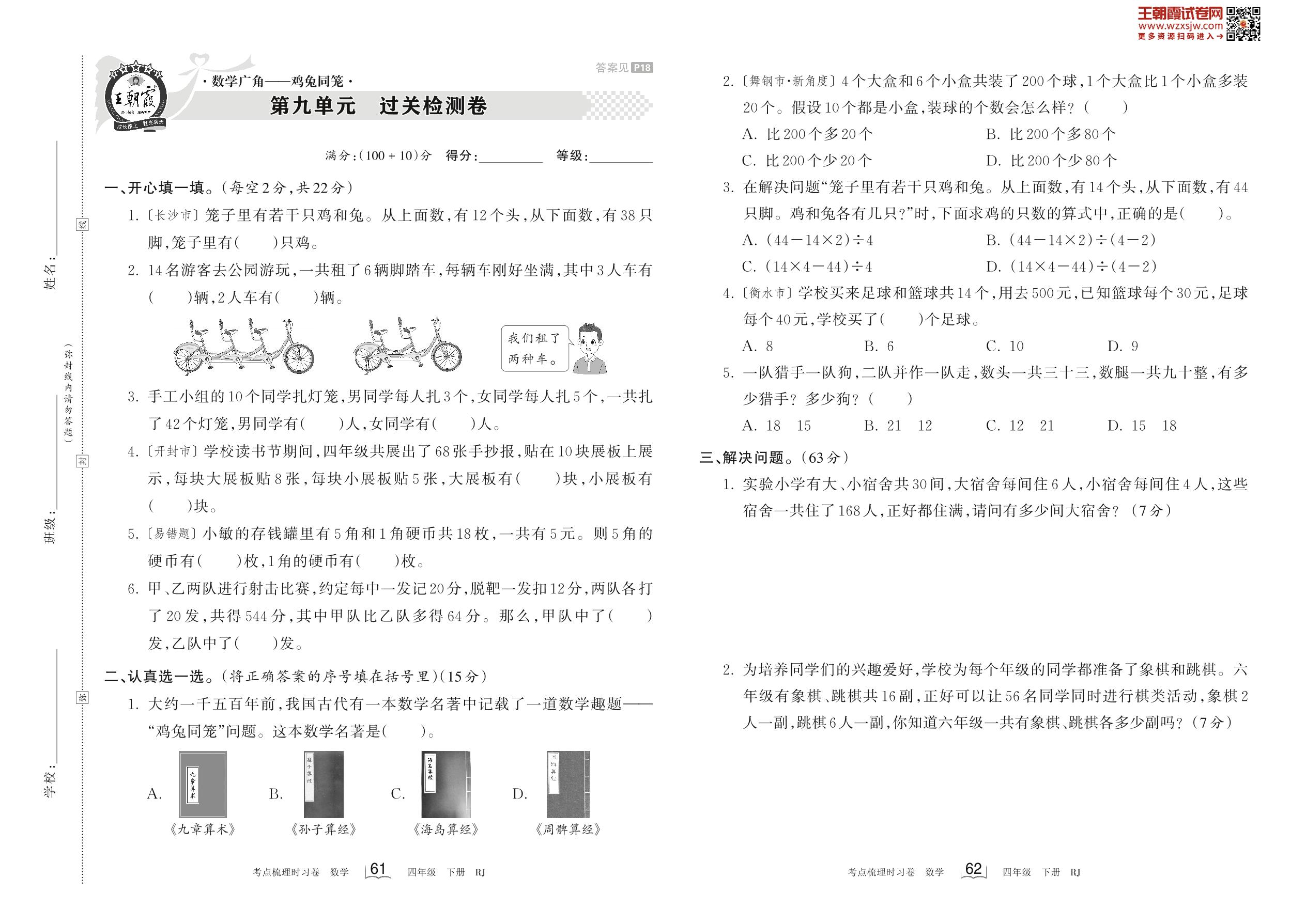 2023下册四年级数学人教版 第九单元 过关检测卷