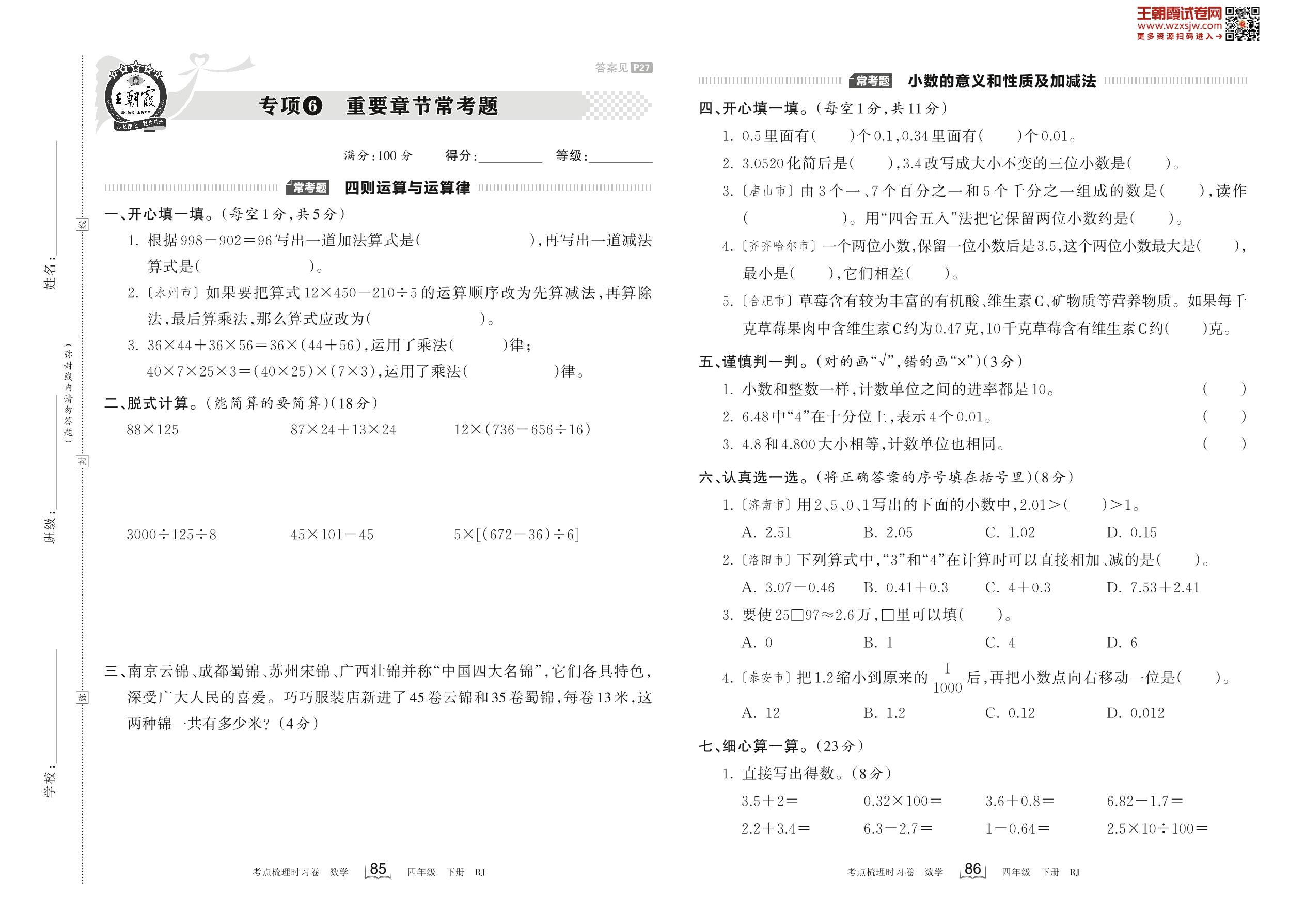 2023下册四年级数学人教版 专项6 重要章节常考题
