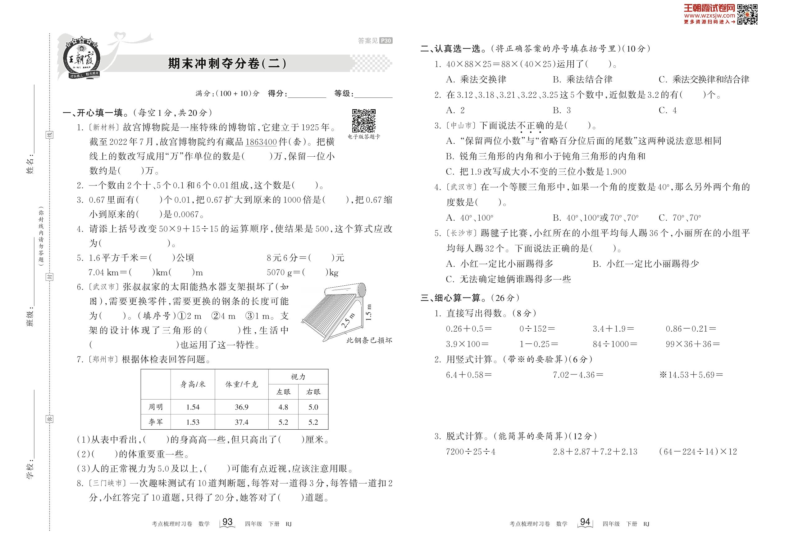 2023下册四年级数学人教版 期末冲刺夺分卷(二)