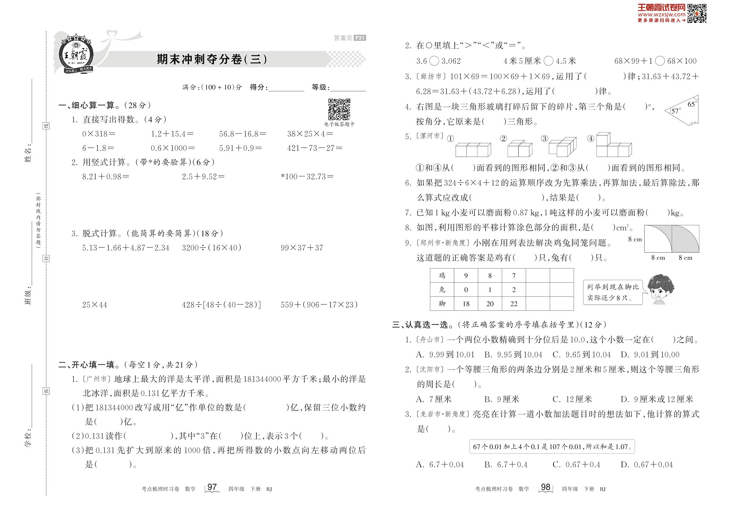 2023下册四年级数学人教版 期末冲刺夺分卷(三)