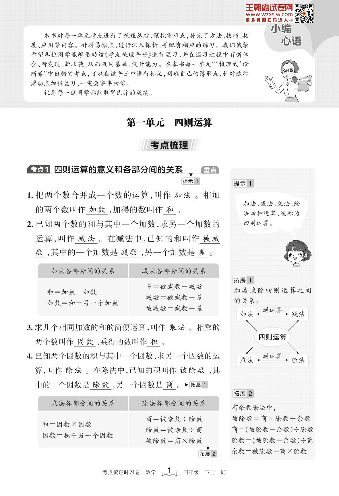 2023下册四年级数学人教版 考点梳理手册——第一单元 四则运算