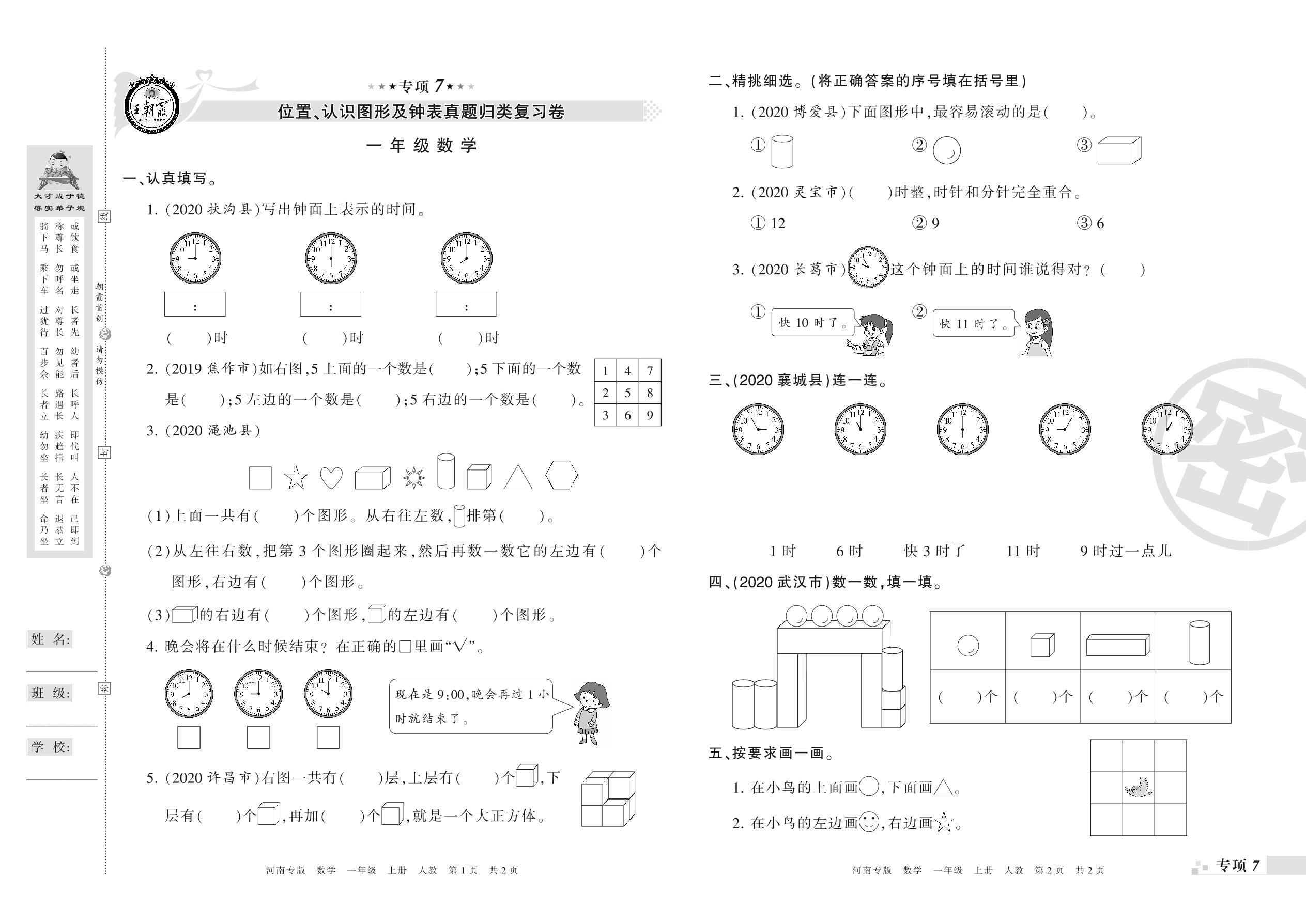 王朝霞期末专项卷——位置、认识图形及钟表真题归类复习、新颖题速递:生活与数学一年级上册数学(人教版)【0】