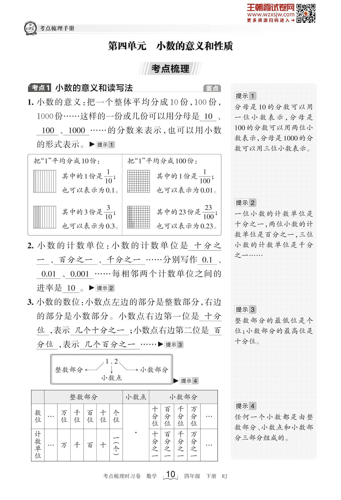 2023下册四年级数学人教版 考点梳理手册——第四单元 小数的意义和性质