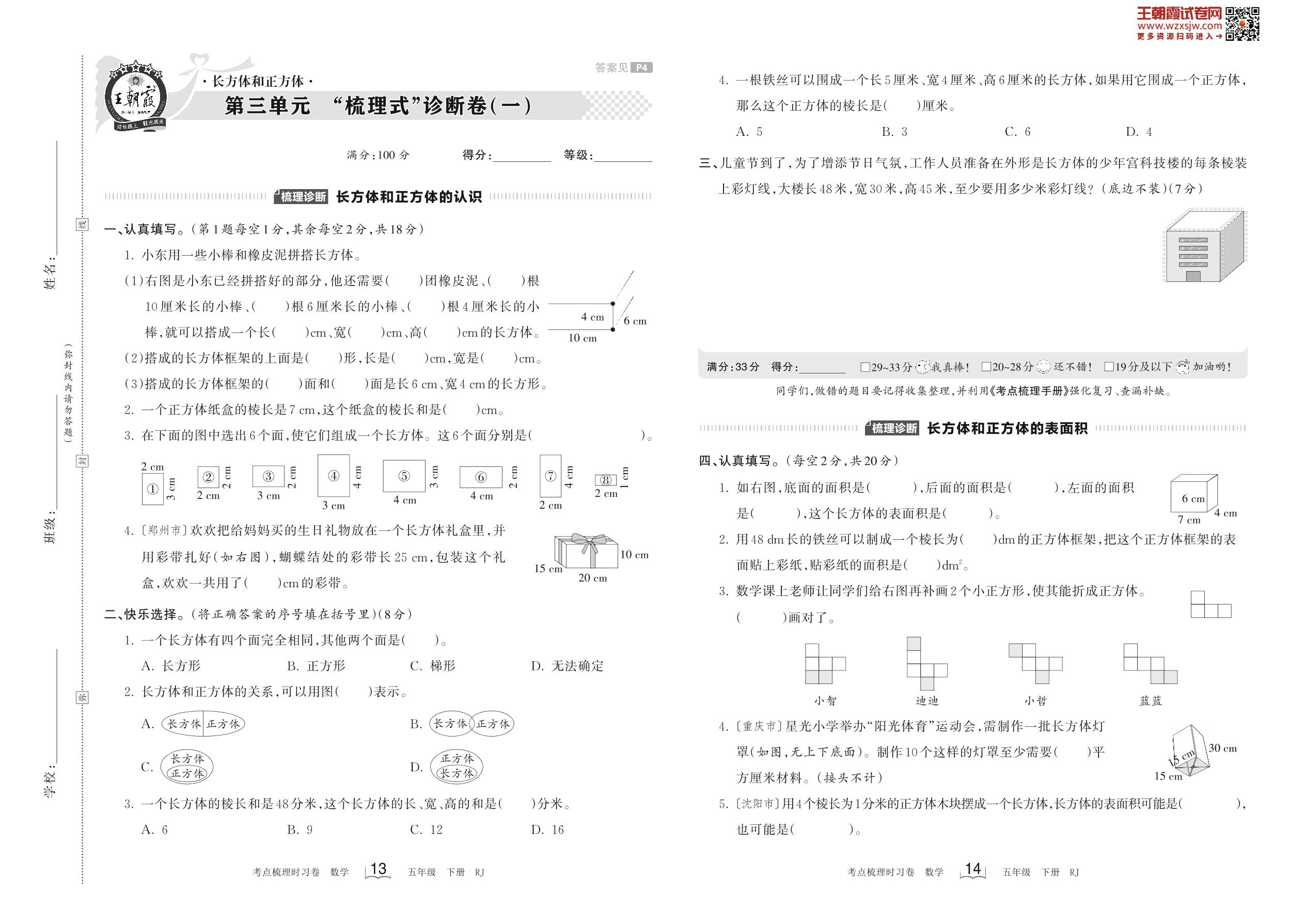 2023下册五年级数学人教版 第三单元 “梳理式”诊断卷(一)