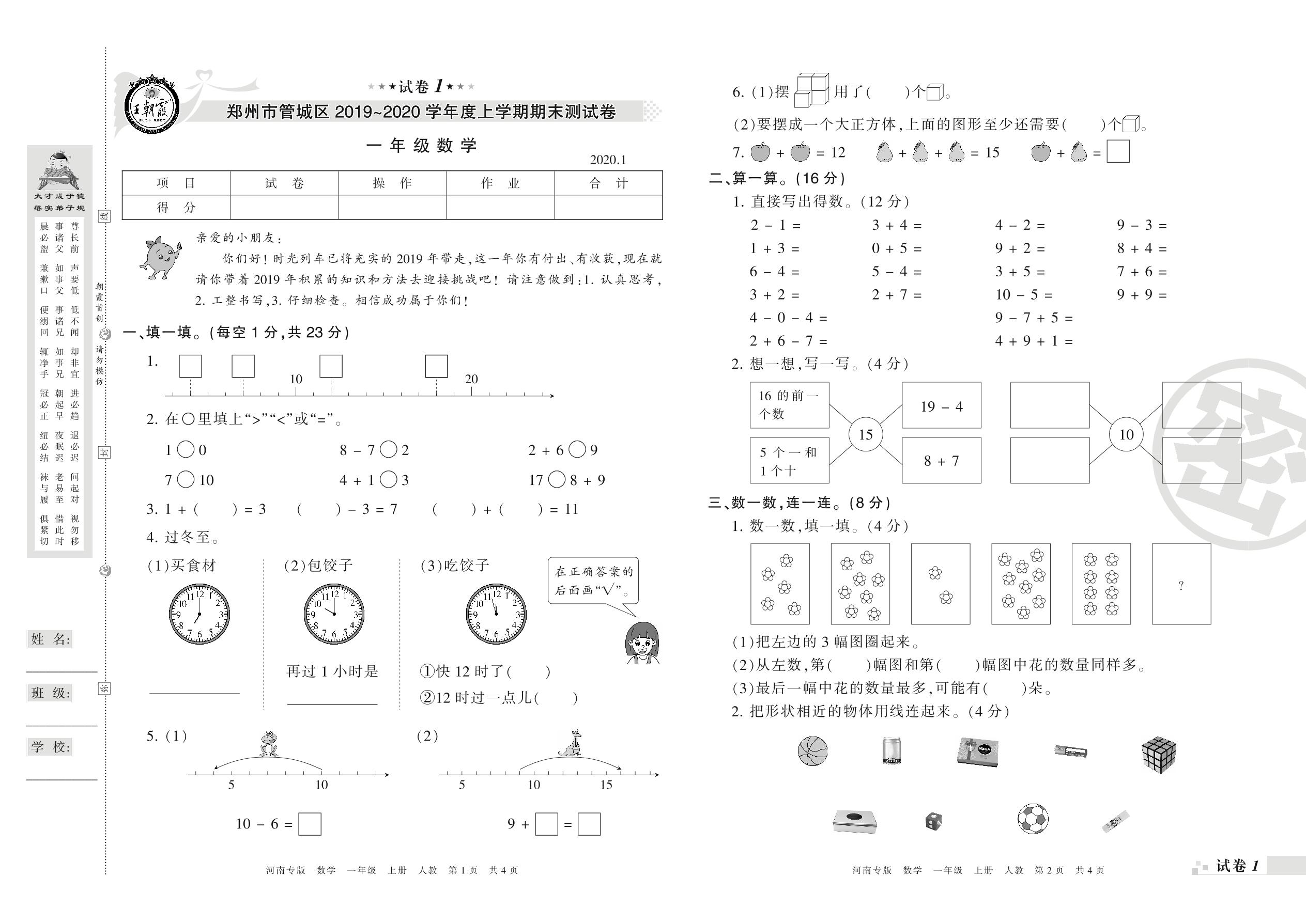 2019-2020学年第一学期郑州市管城区一年级数学试卷(人教版)【1】