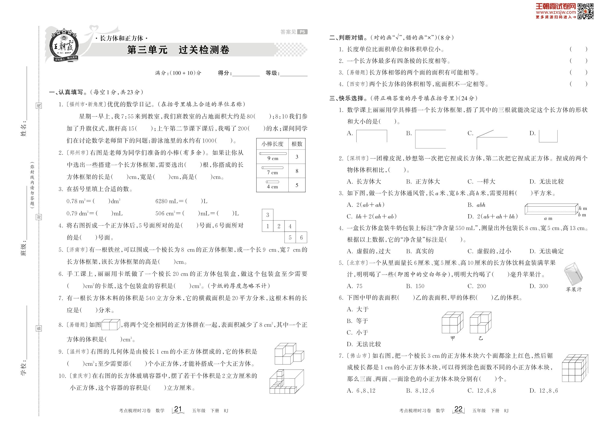 2023下册五年级数学人教版 第三单元 过关检测卷