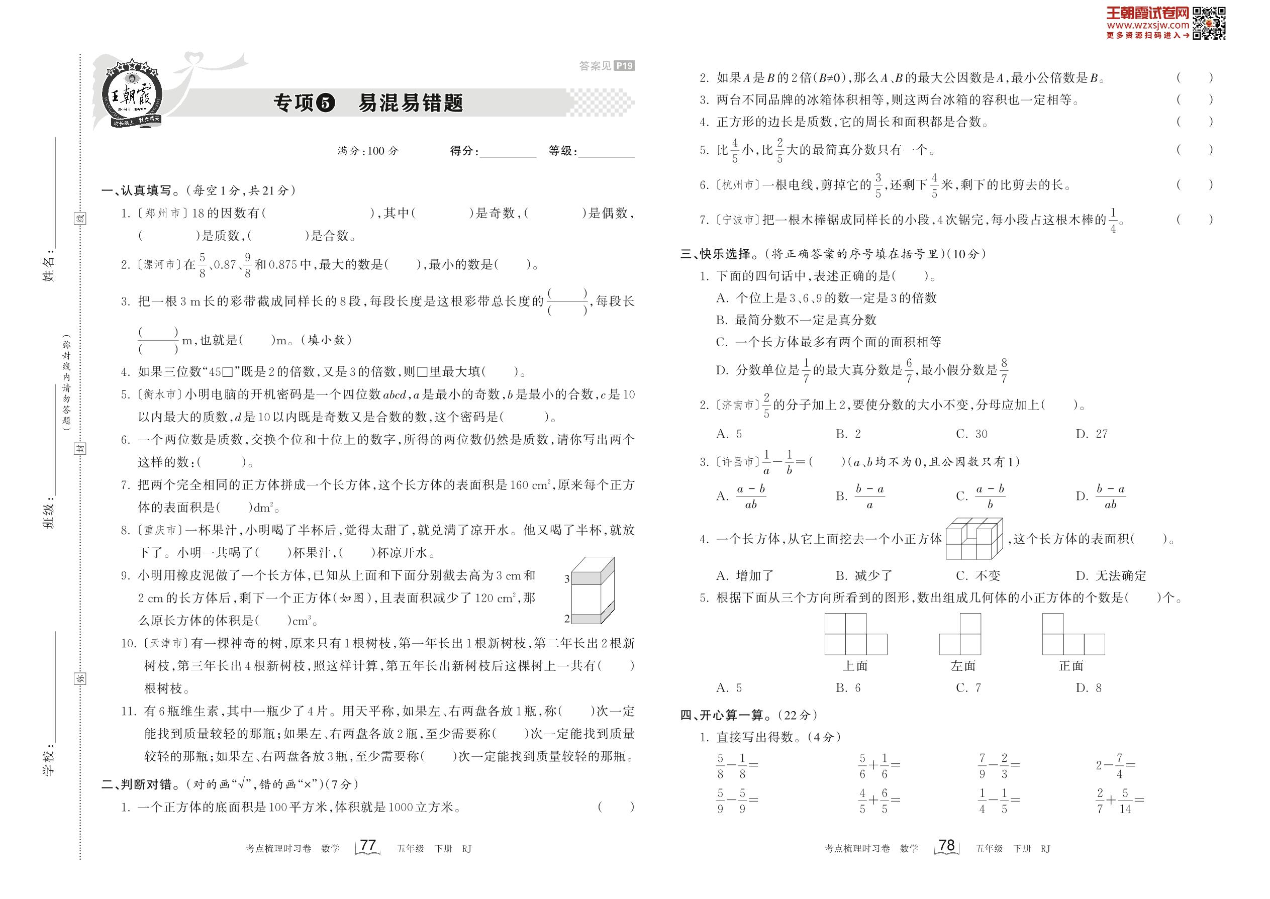 2023下册五年级数学人教版 专项5 易混易错题