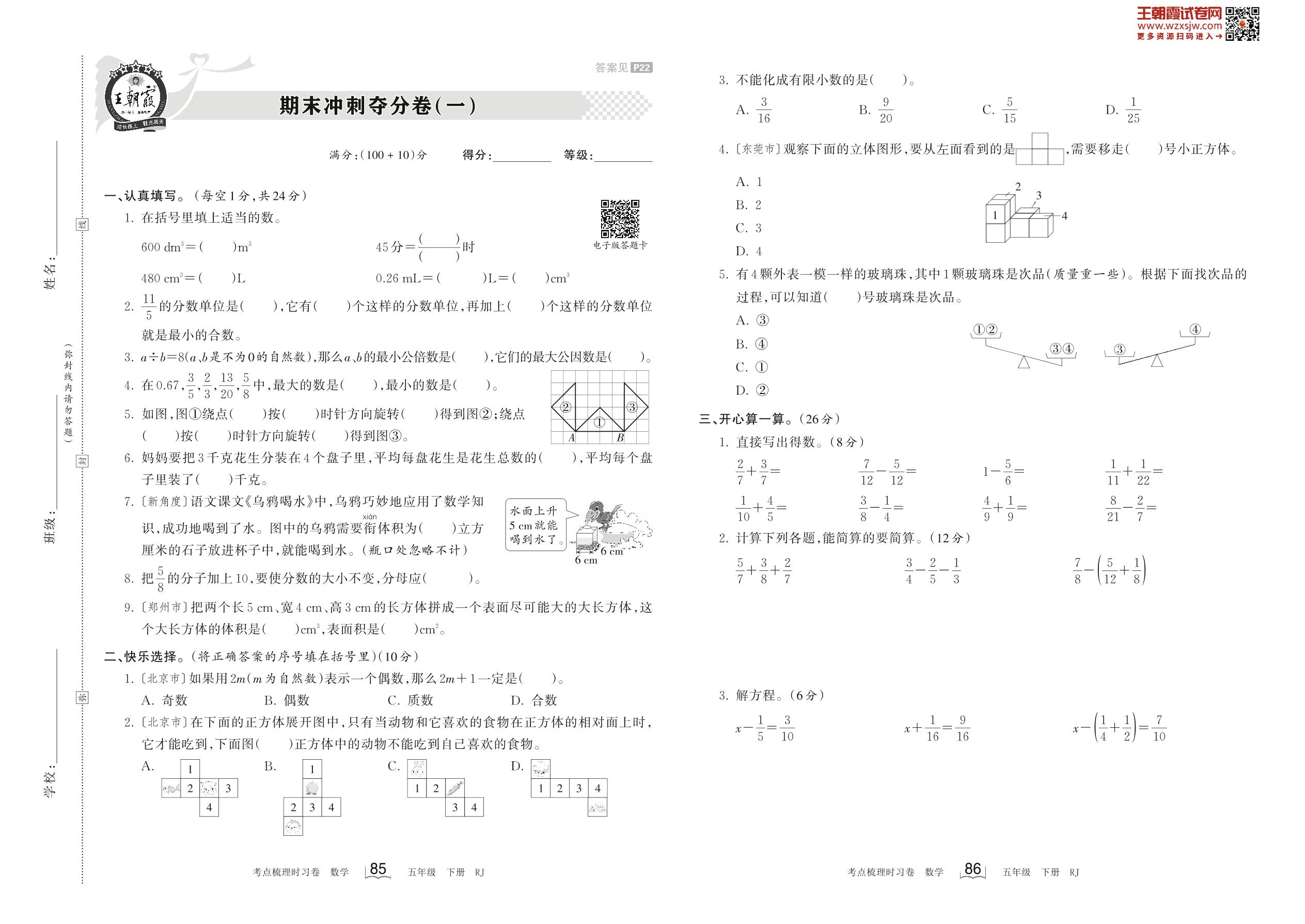 2023下册五年级数学人教版 期末冲刺夺分卷(一)