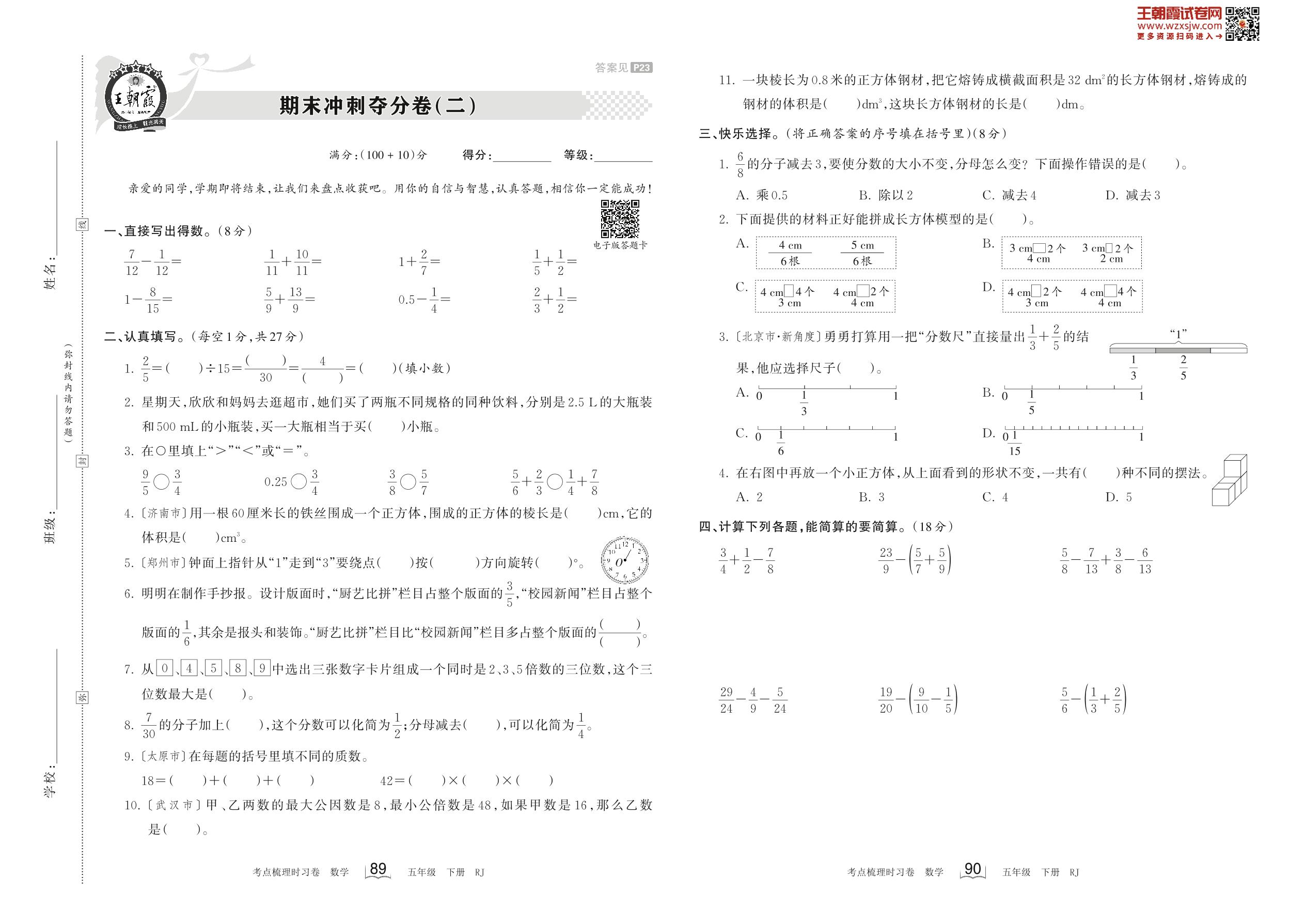 2023下册五年级数学人教版 期末冲刺夺分卷(二)