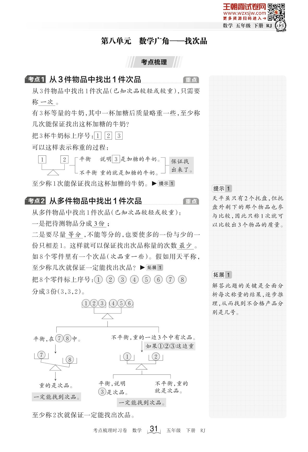 2023下册五年级数学人教版 考点梳理手册——第八单元 数学广角——找次品