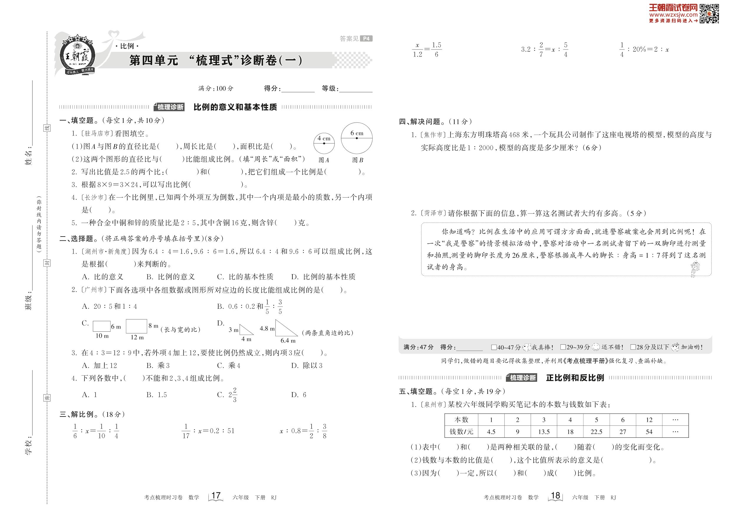 2023下册六年级数学人教版 第四单元 “梳理式”诊断卷(一)