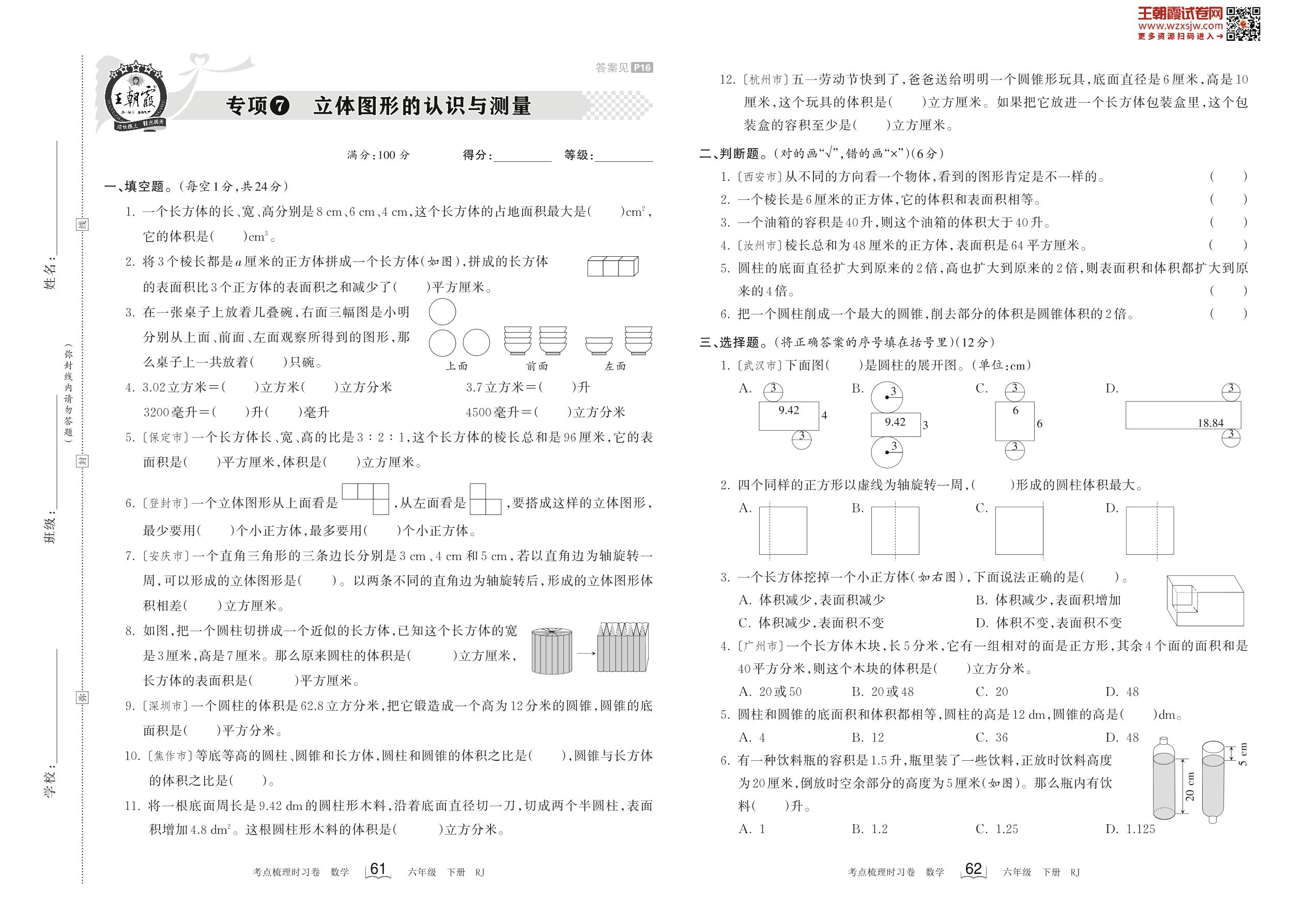 2023下册六年级数学人教版 专项7 立体图形的认识与测量