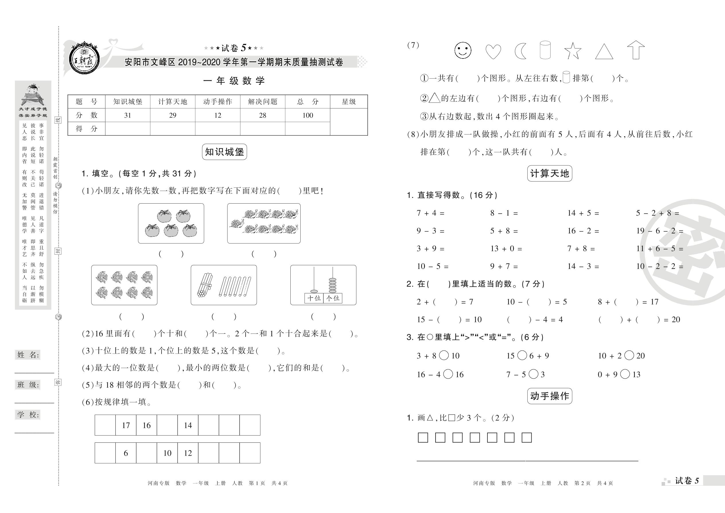2019-2020学年第一学期安阳市文峰区一年级数学试卷(人教版)【5】