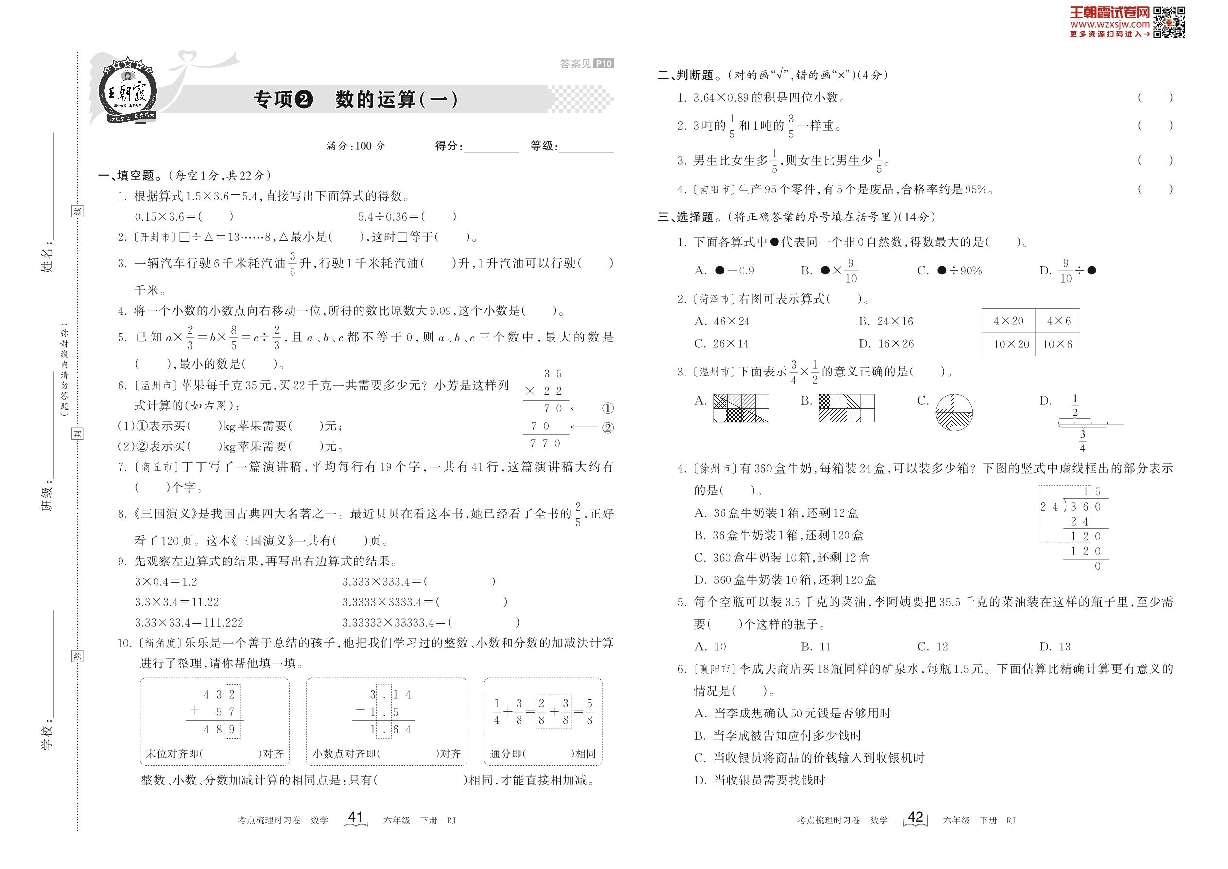 2023下册六年级数学人教版 专项2 数的运算(一)