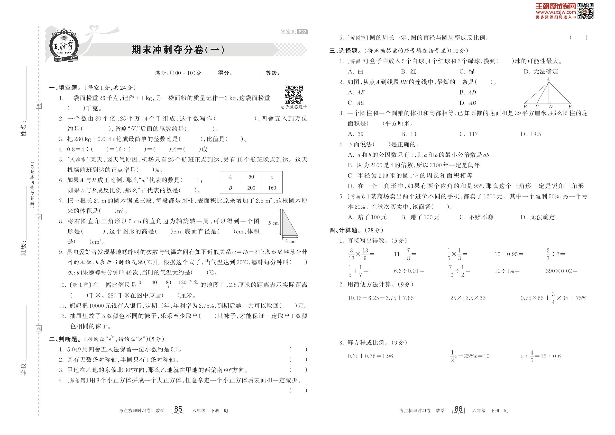 2023下册六年级数学人教版 期末冲刺夺分卷(一)