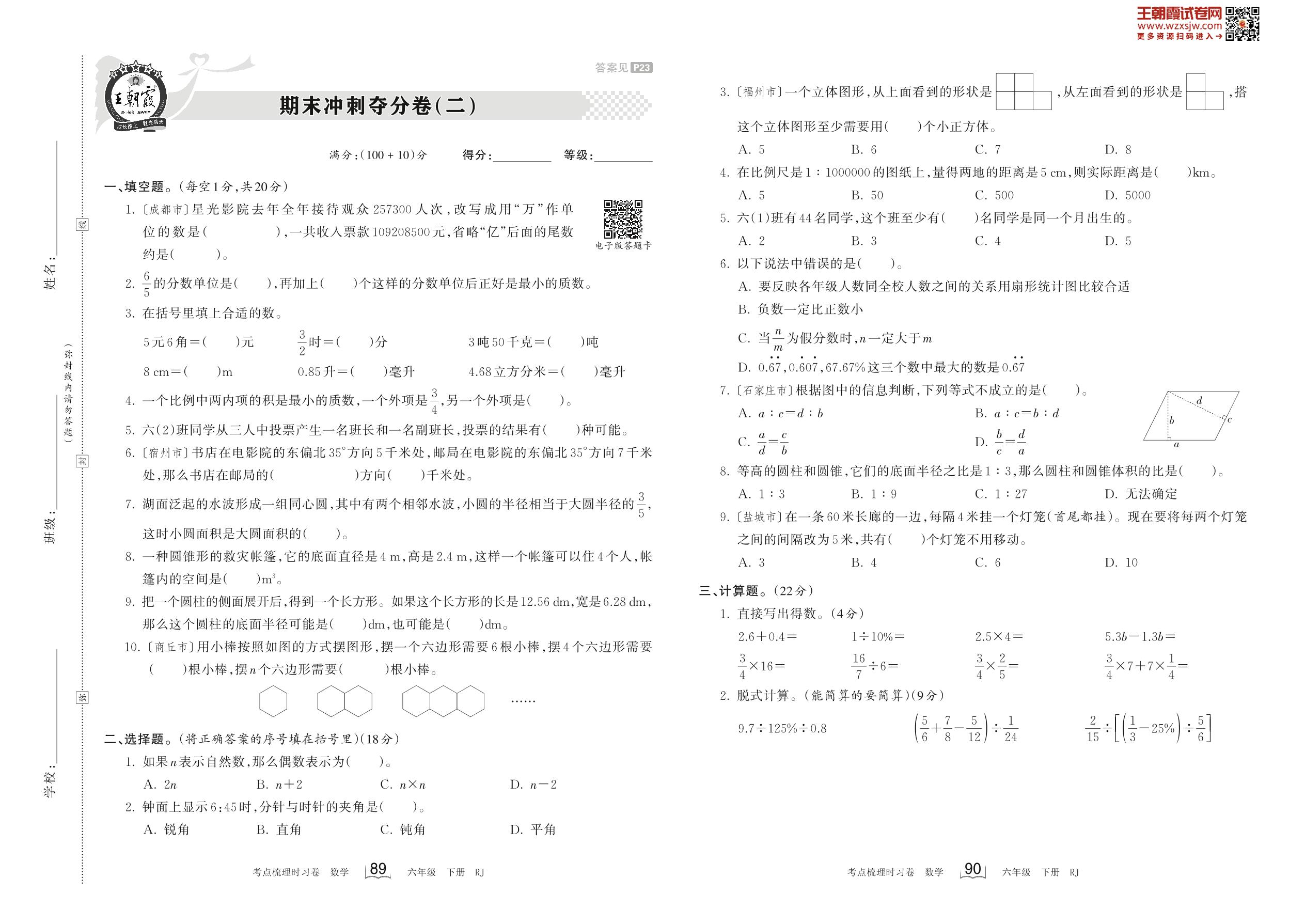 2023下册六年级数学人教版 期末冲刺夺分卷(二)