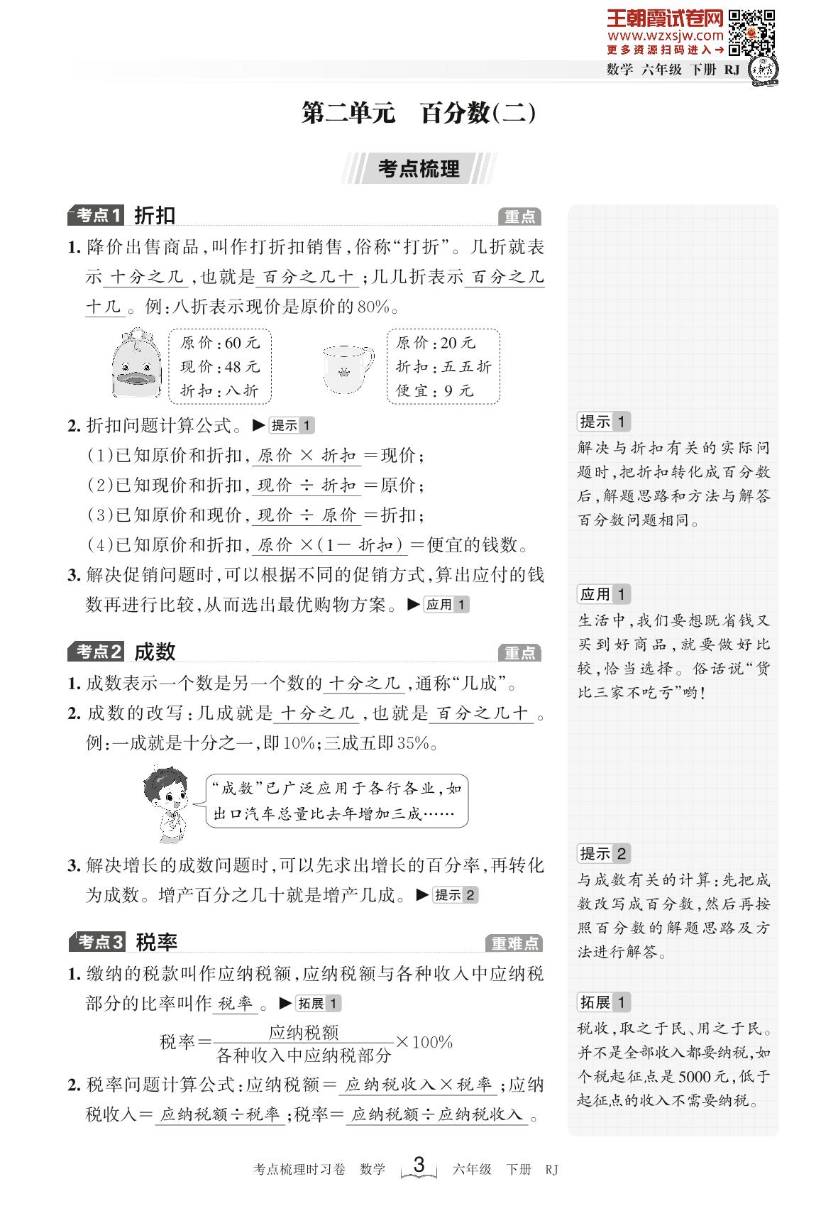 2023下册六年级数学人教版 考点梳理手册——第二单元 百分数(二)