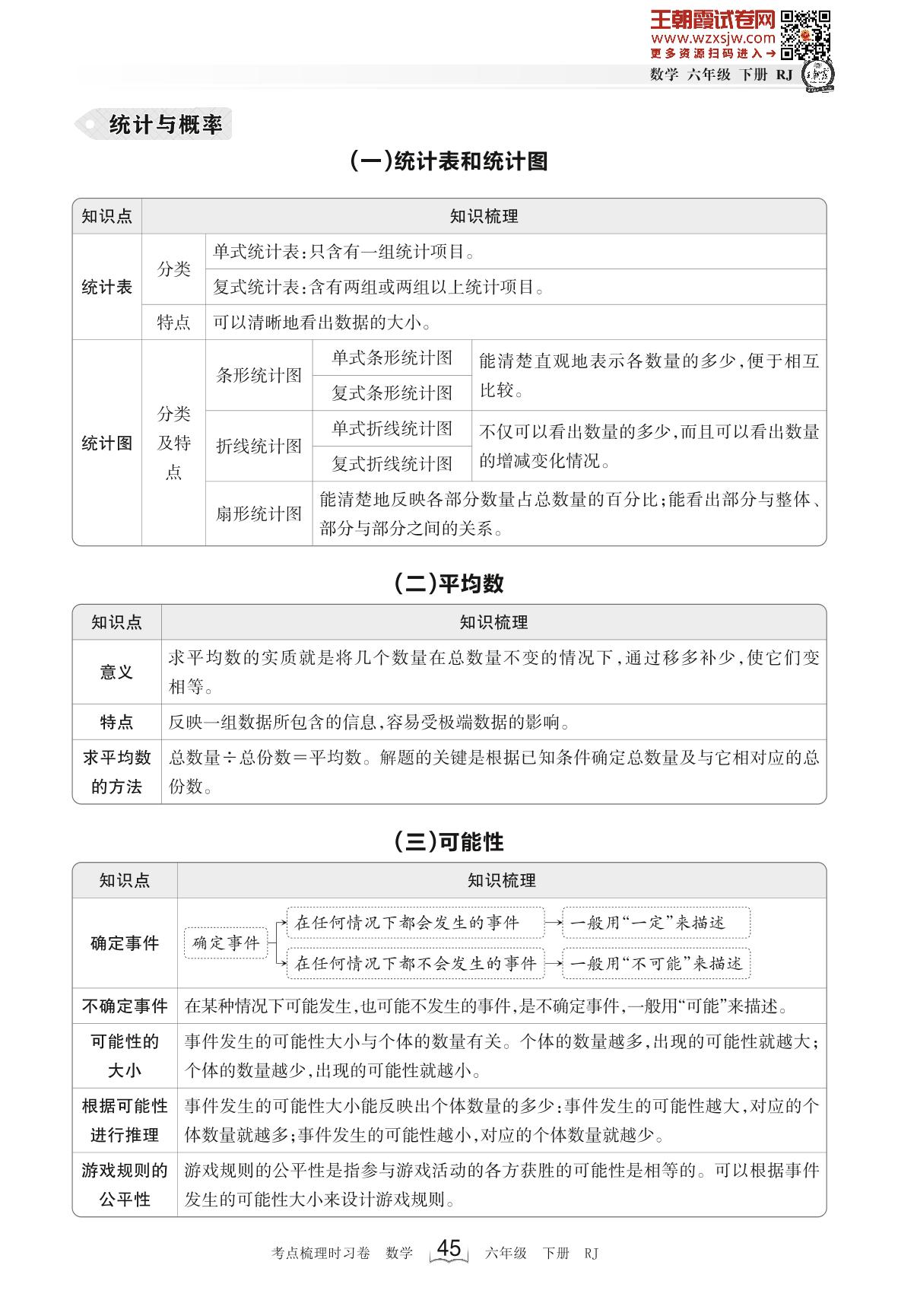2023下册六年级数学人教版 考点梳理手册——第六单元 整理和复习——统计与概率