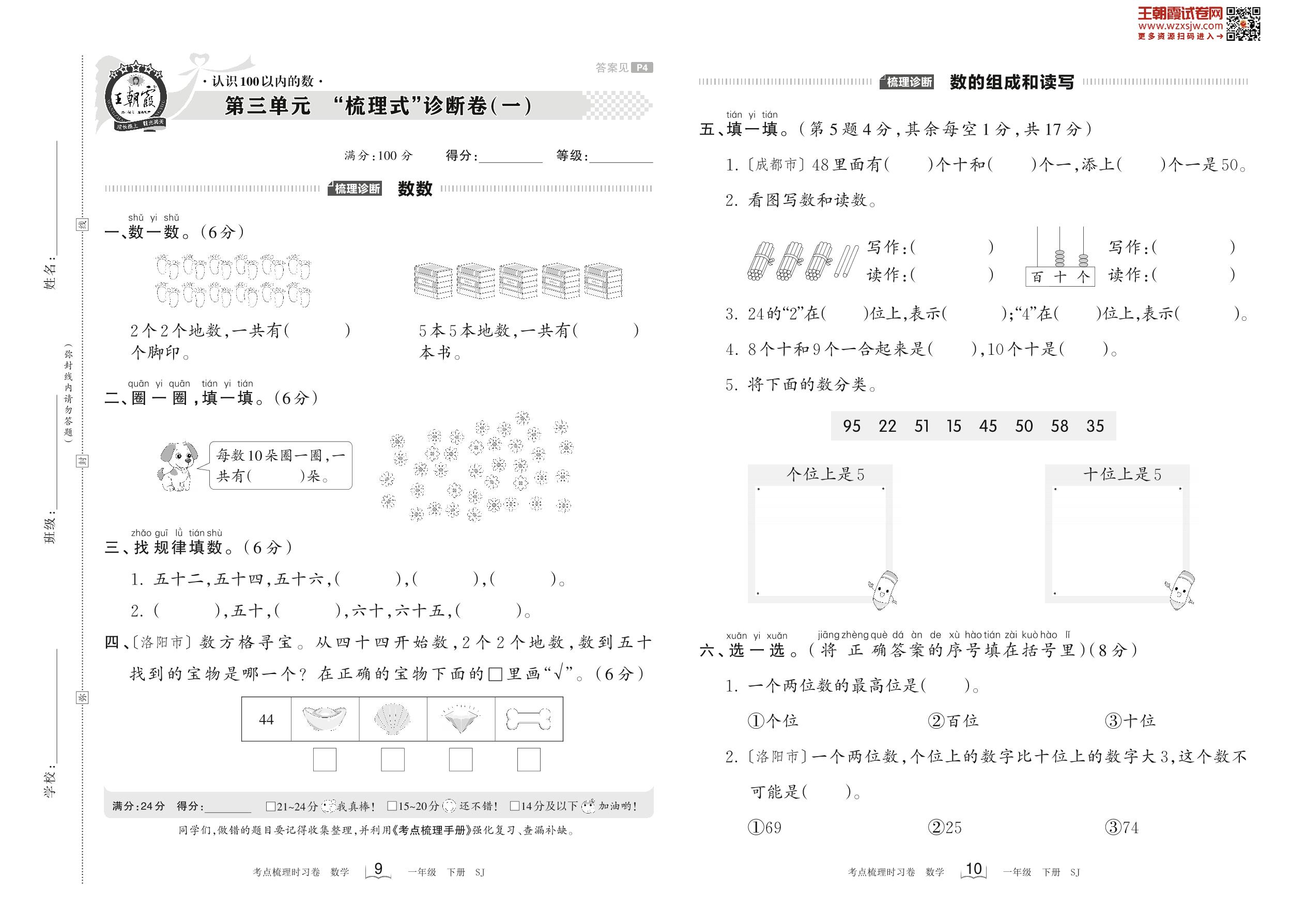 2023下册一年级数学苏教版 第三单元 “梳理式”诊断卷(一)