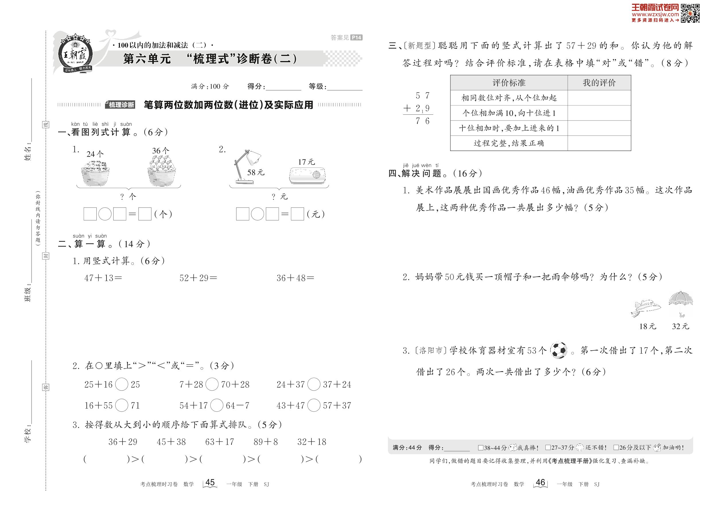 2023下册一年级数学苏教版 第六单元 “梳理式”诊断卷(二)