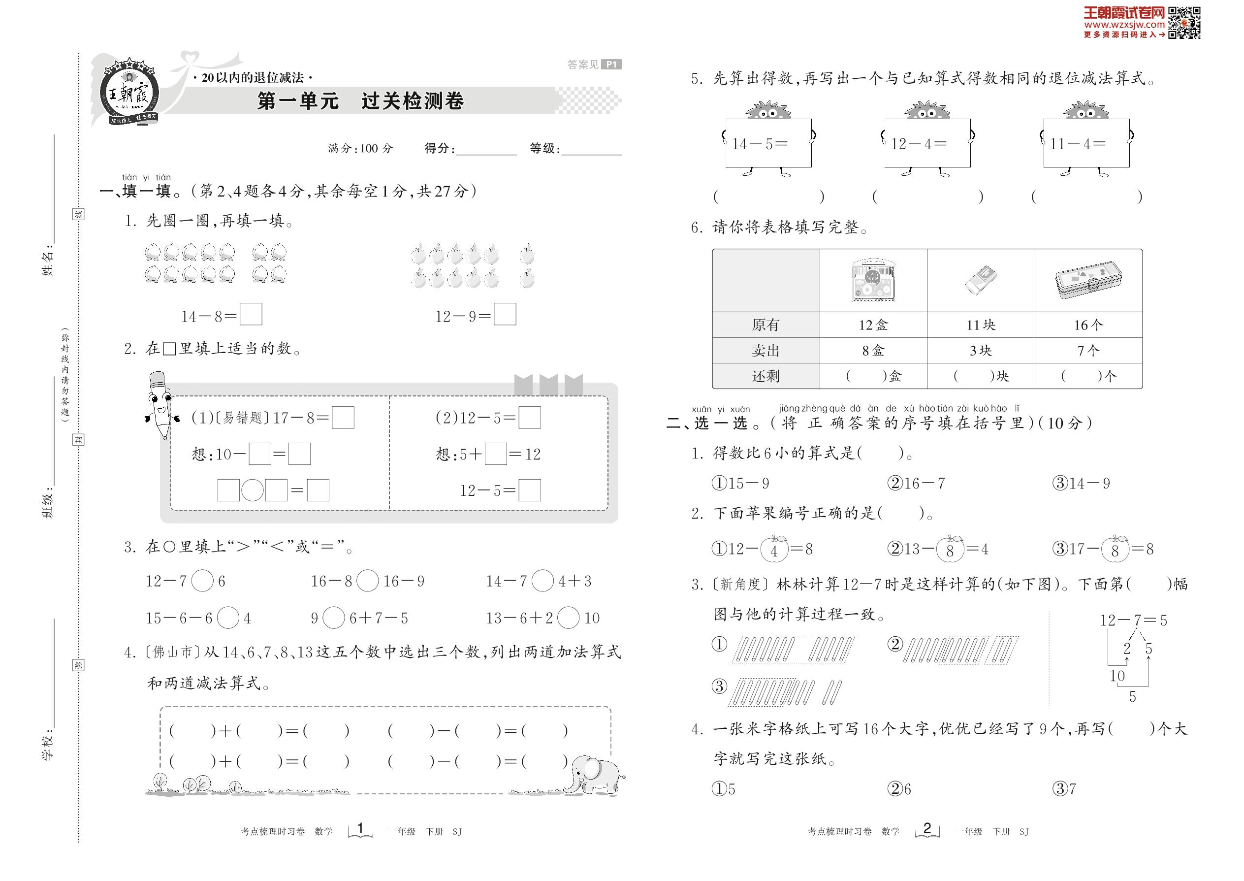 一年级数学苏教版下册单元卷