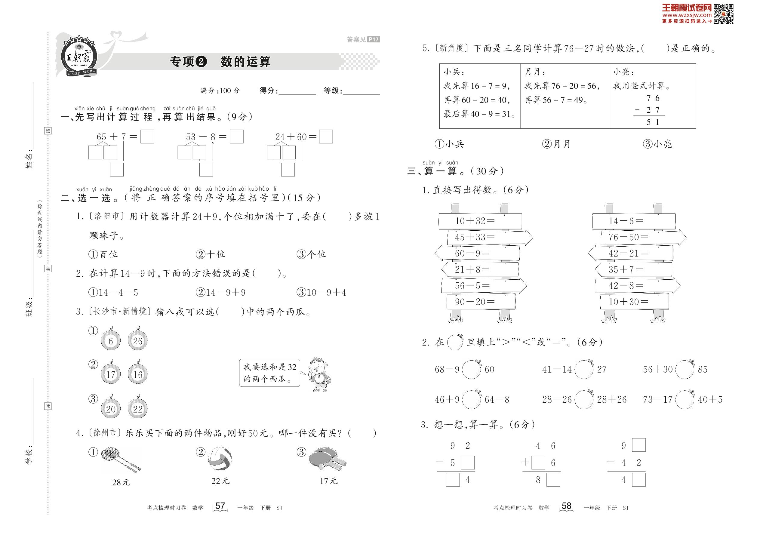 一年级数学苏教版下册专项卷