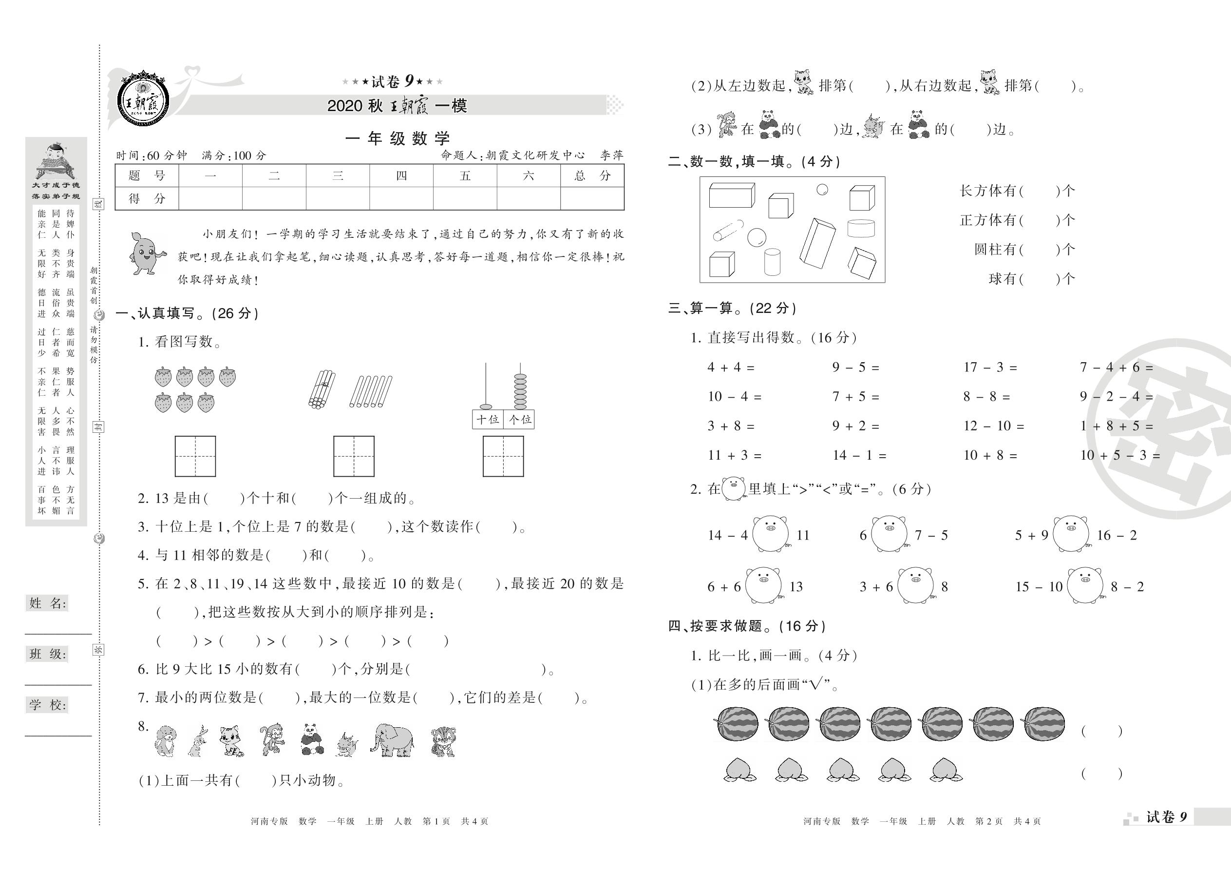 王朝霞期末模拟卷一年级上册数学(人教版)_R210802211317【9】