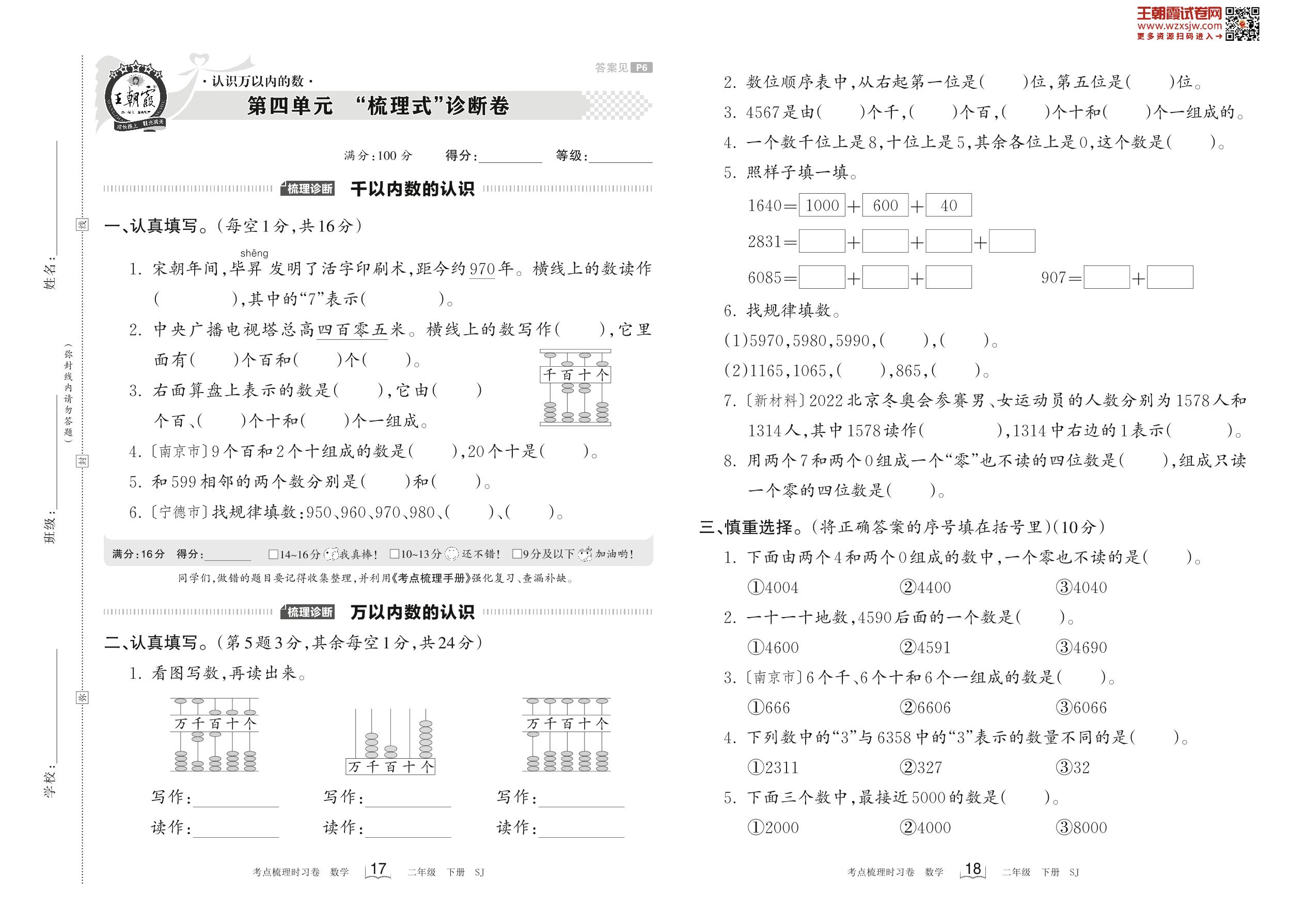 2023下册二年级数学苏教版 第四单元 “梳理式”诊断卷