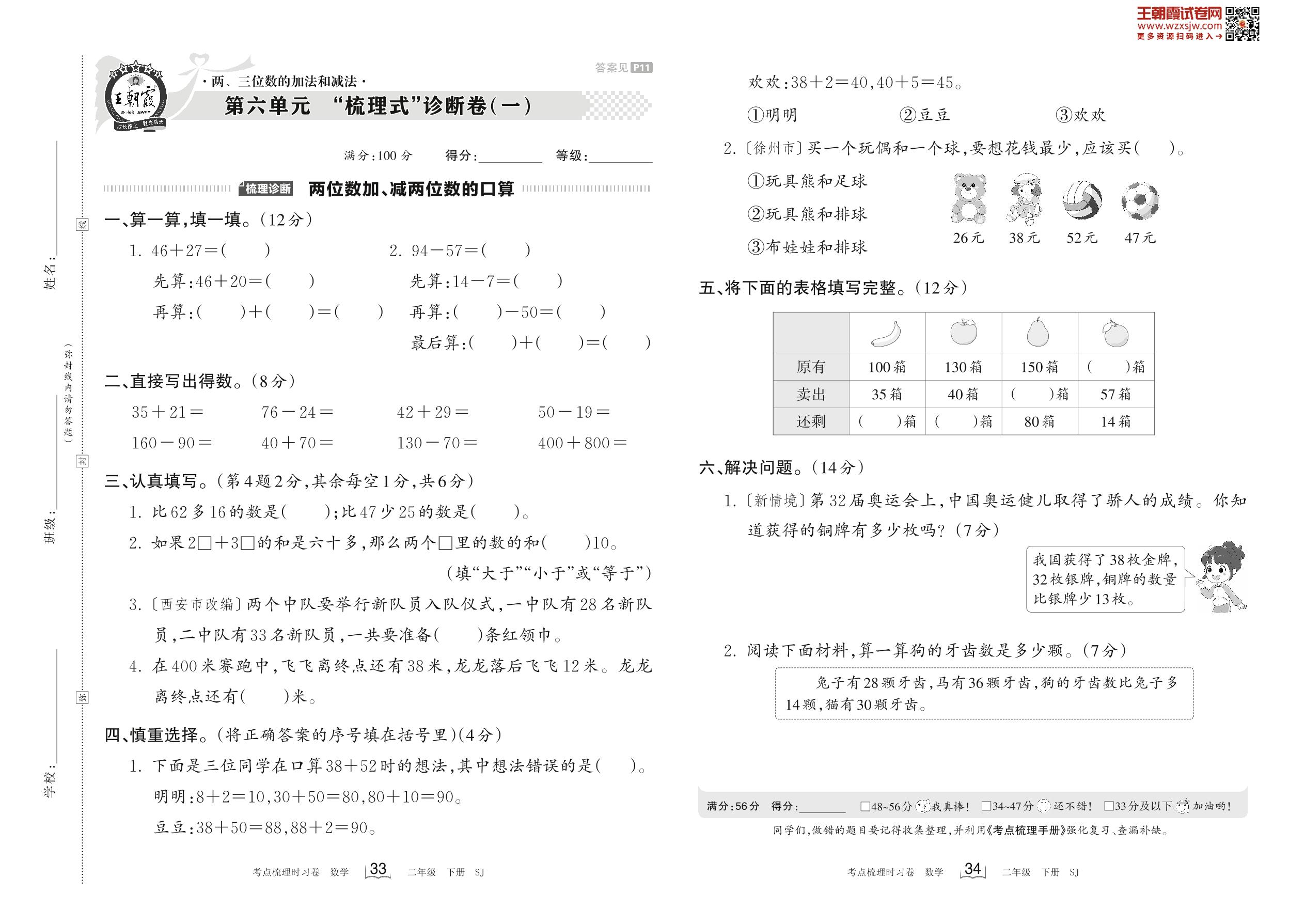 2023下册二年级数学苏教版 第六单元 “梳理式”诊断卷(一)