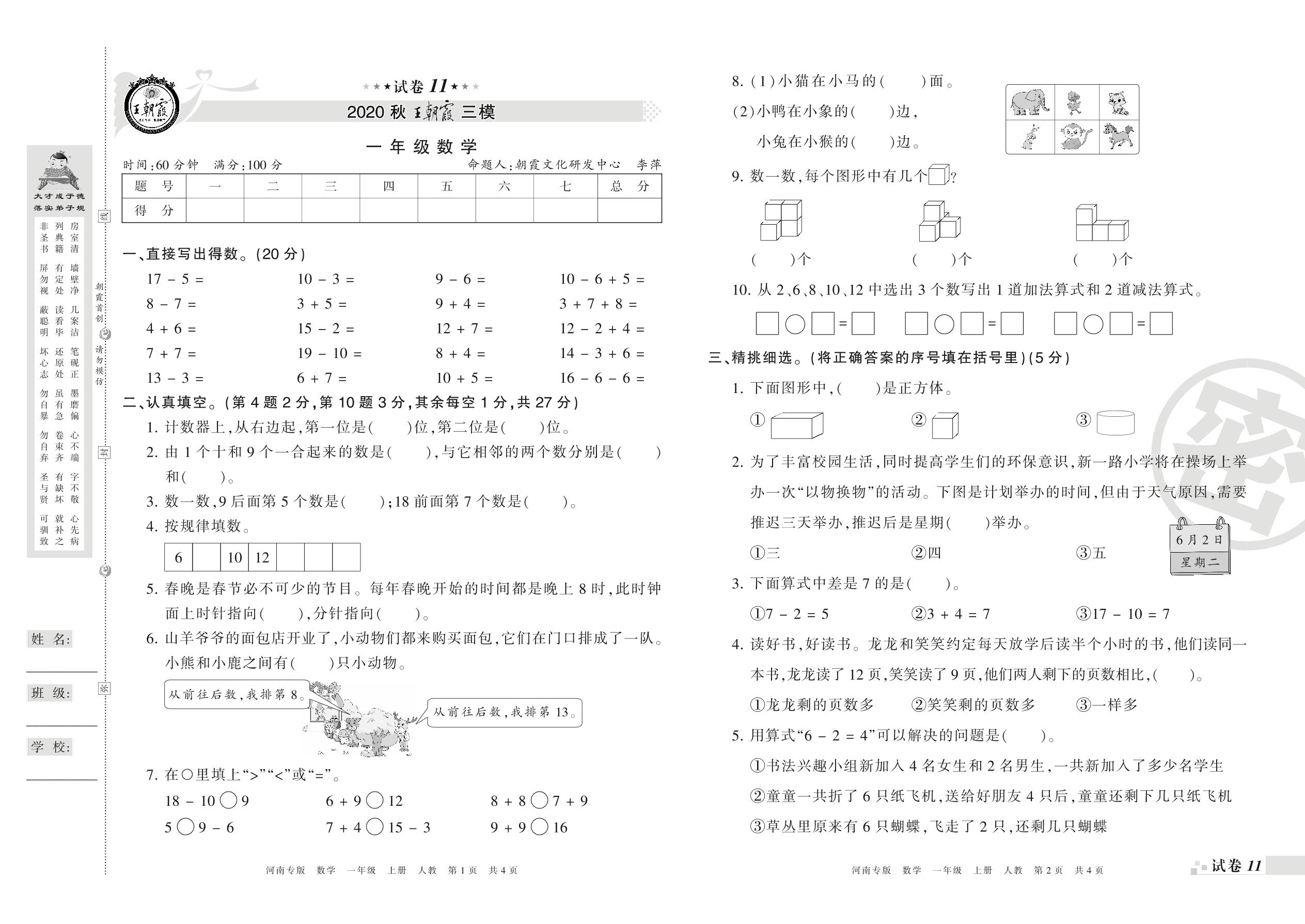 王朝霞期末模拟卷一年级上册数学(人教版)_R210802211325【11】
