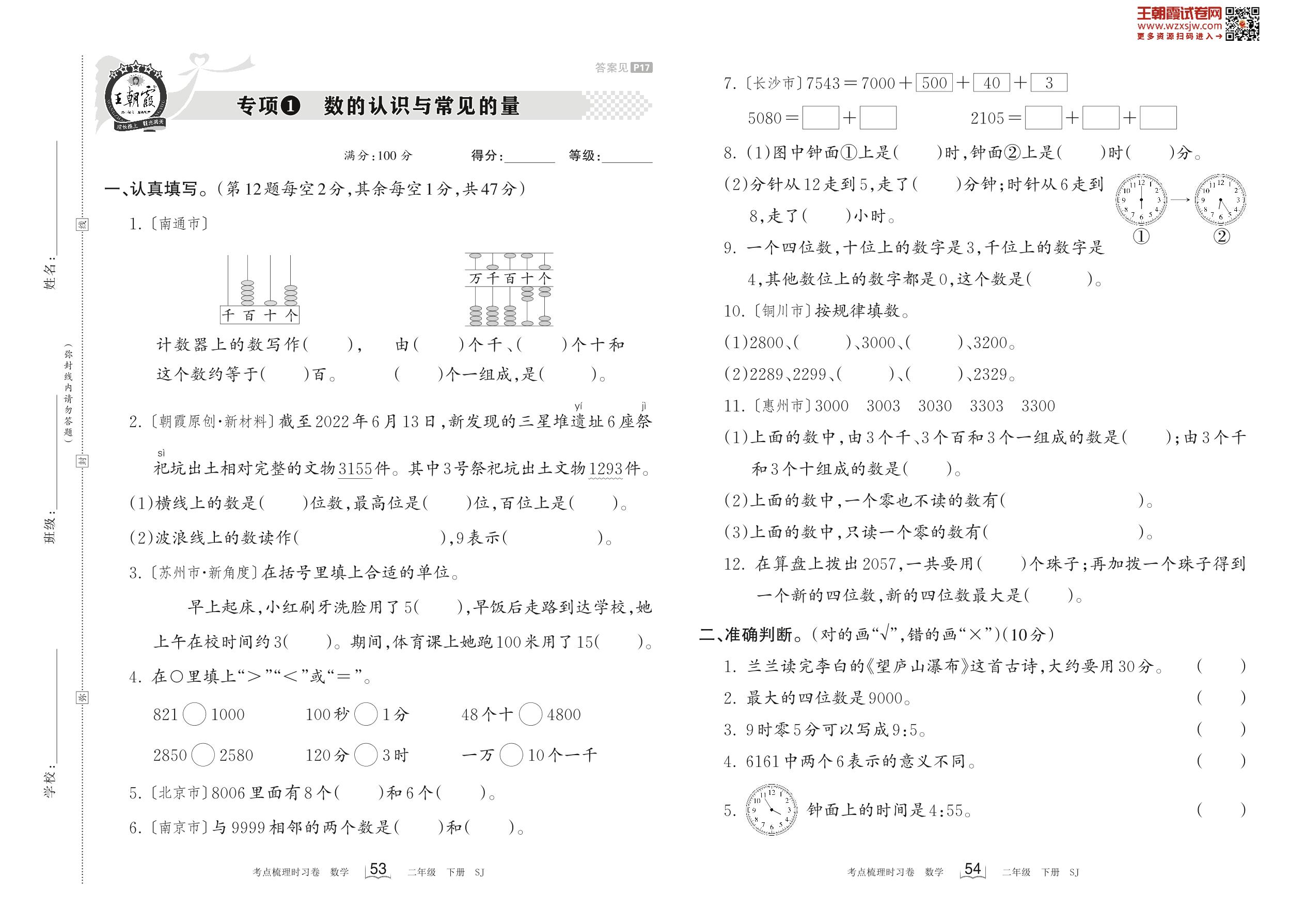 2023下册二年级数学苏教版 专项1 数的认识与常见的量