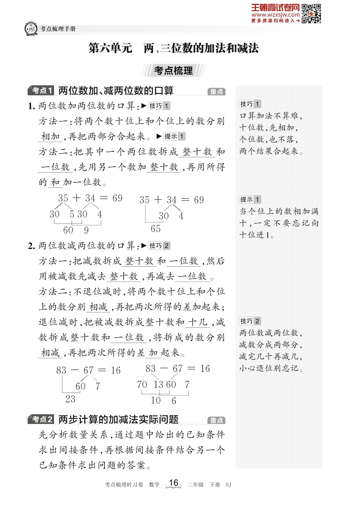2023下册二年级数学苏教版 考点梳理手册——第六单元 两、三位数的加法和减法