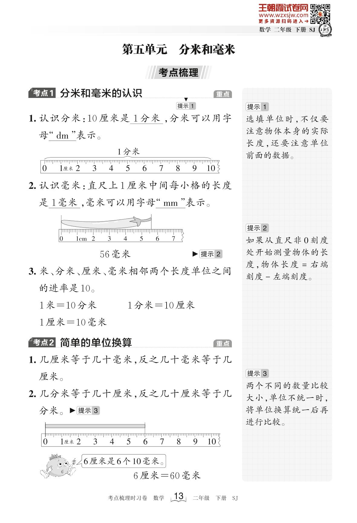 2023下册二年级数学苏教版 考点梳理手册——第五单元 分米和毫米